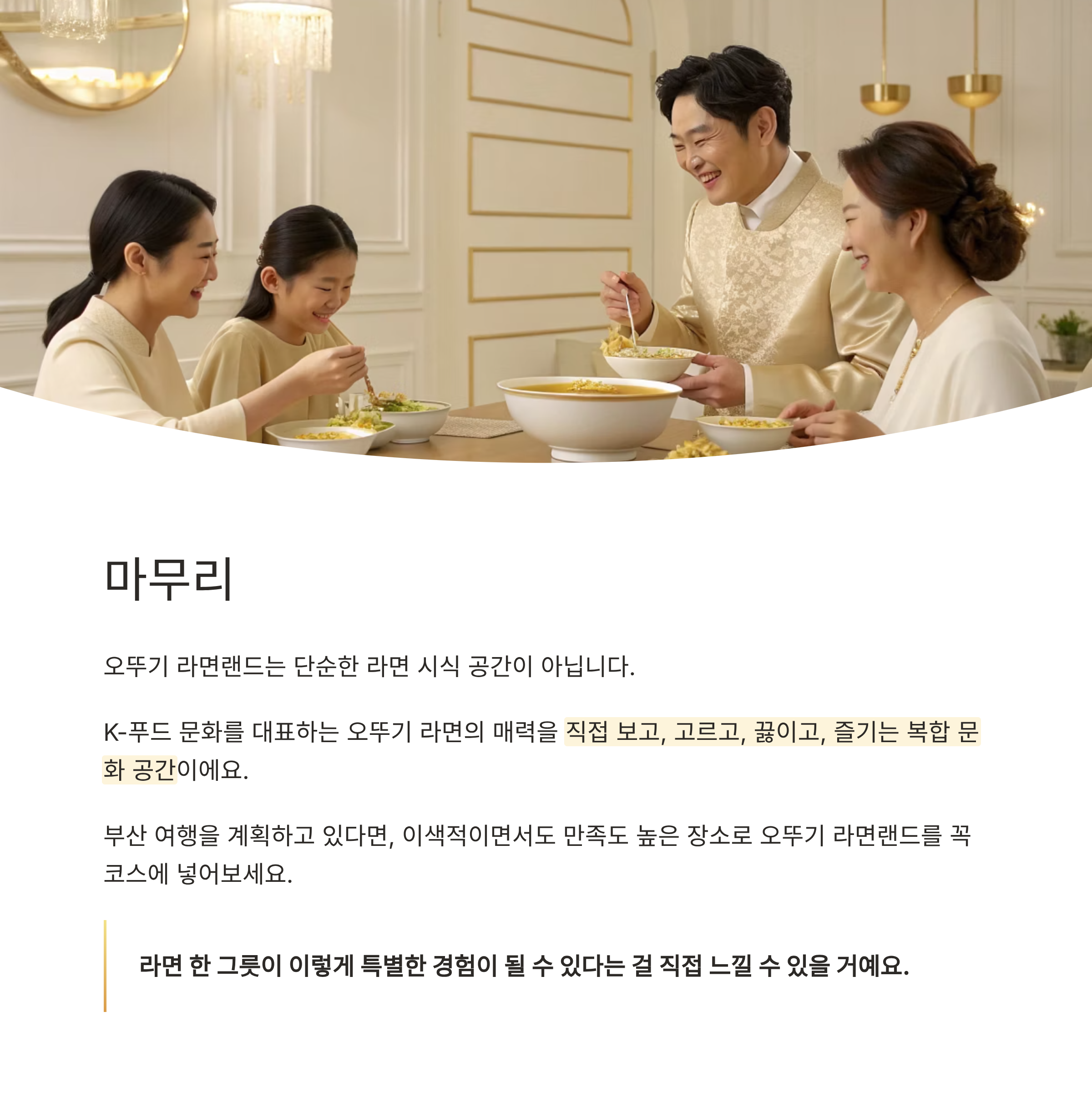 오뚜기 라면랜드는 단순한 라면 시식 공간이 아닙니다. K-푸드 문화를 대표하는 오뚜기 라면의 매력을 직접 보고, 고르고, 끓이고, 즐기는 복합 문화 공간이에요. 부산 여행을 계획하고 있다면, 이색적이면서도 만족도 높은 장소로 오뚜기 라면랜드를 꼭 코스에 넣어보세요. 라면 한 그릇이 이렇게 특별한 경험이 될 수 있다는 걸 직접 느낄 수 있을 거예요.