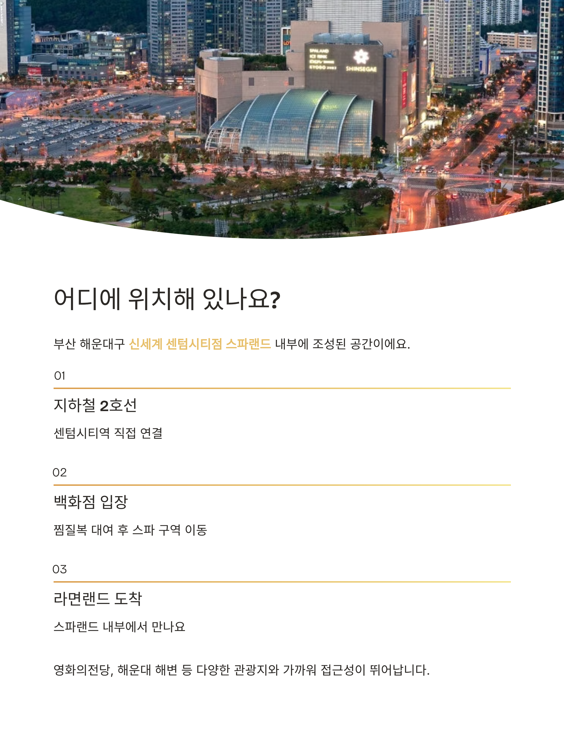 센텀시티는 영화의전당, 해운대 해변 등 다양한 관광지와 가까워 라면랜드 방문 전후로 다양한 스팟을 함께 즐길 수 있는 이점도 있어요.