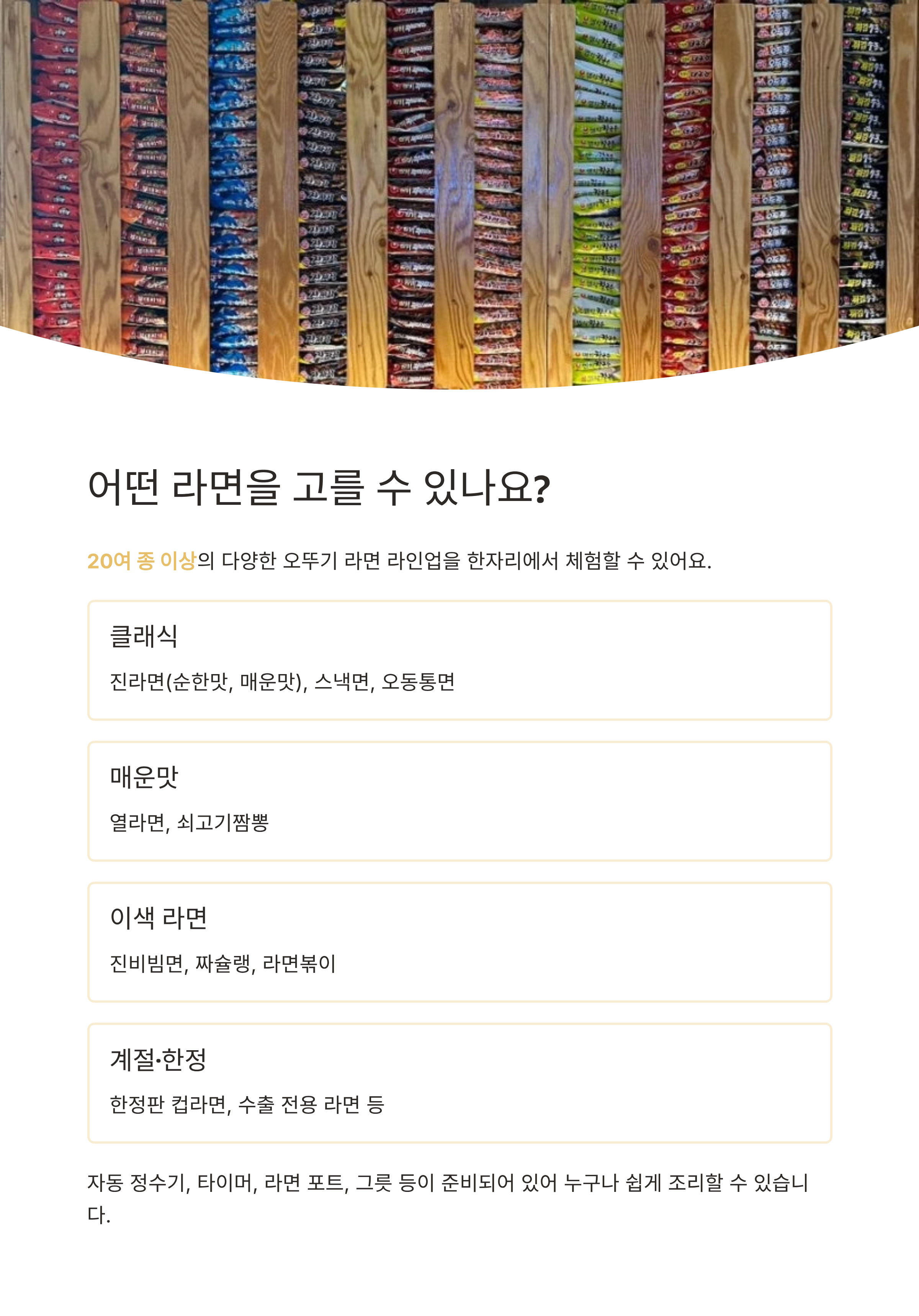 | 셀프 라면존 | 다양한 오뚜기 라면 직접 선택 및 조리 가능 |
