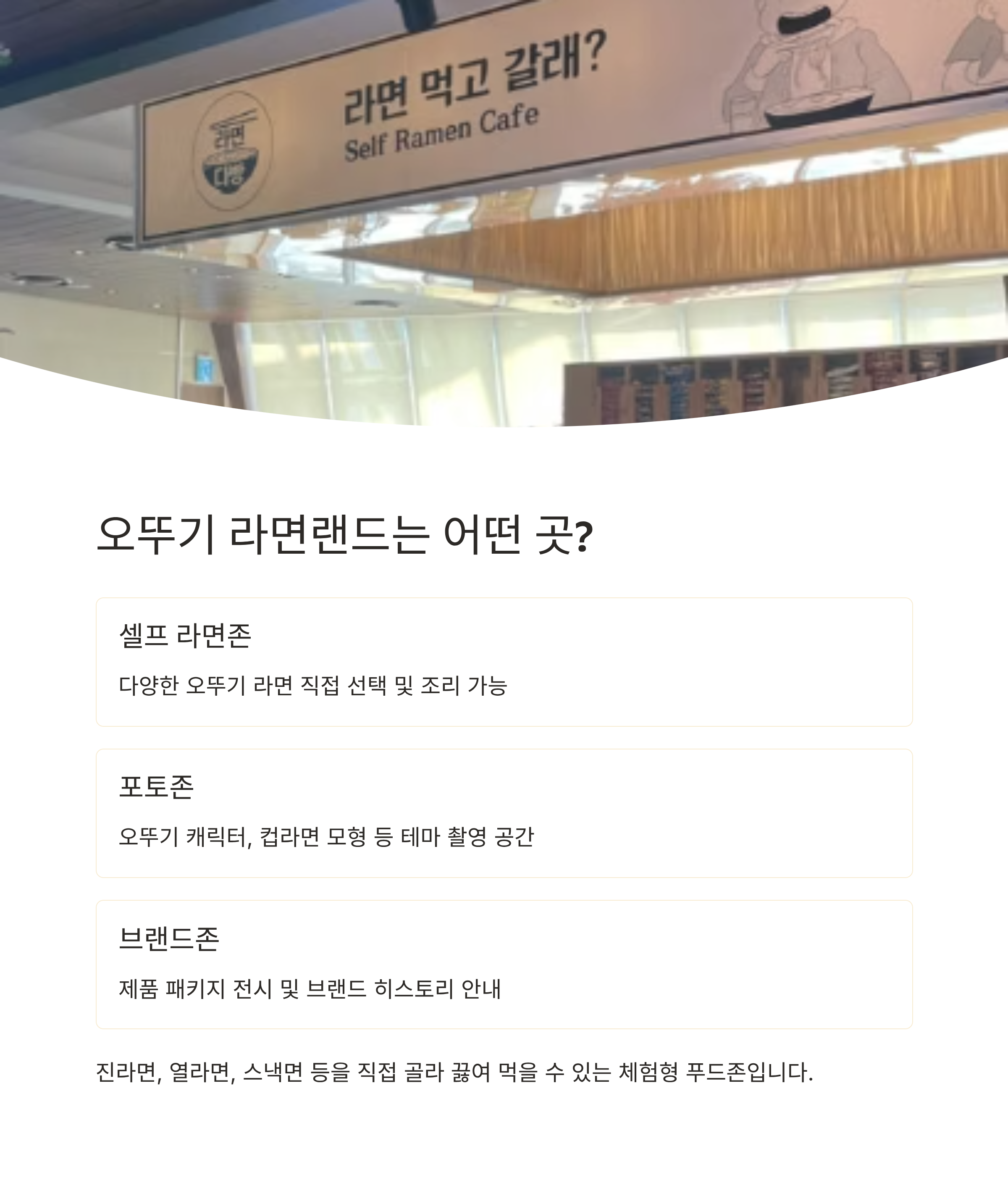 하루 코스로도 충분한 일정 구성이 가능하니, 여행객이라면 라면랜드와 주변 명소를 함께 묶어 즐겨보는 것을 추천합니다.