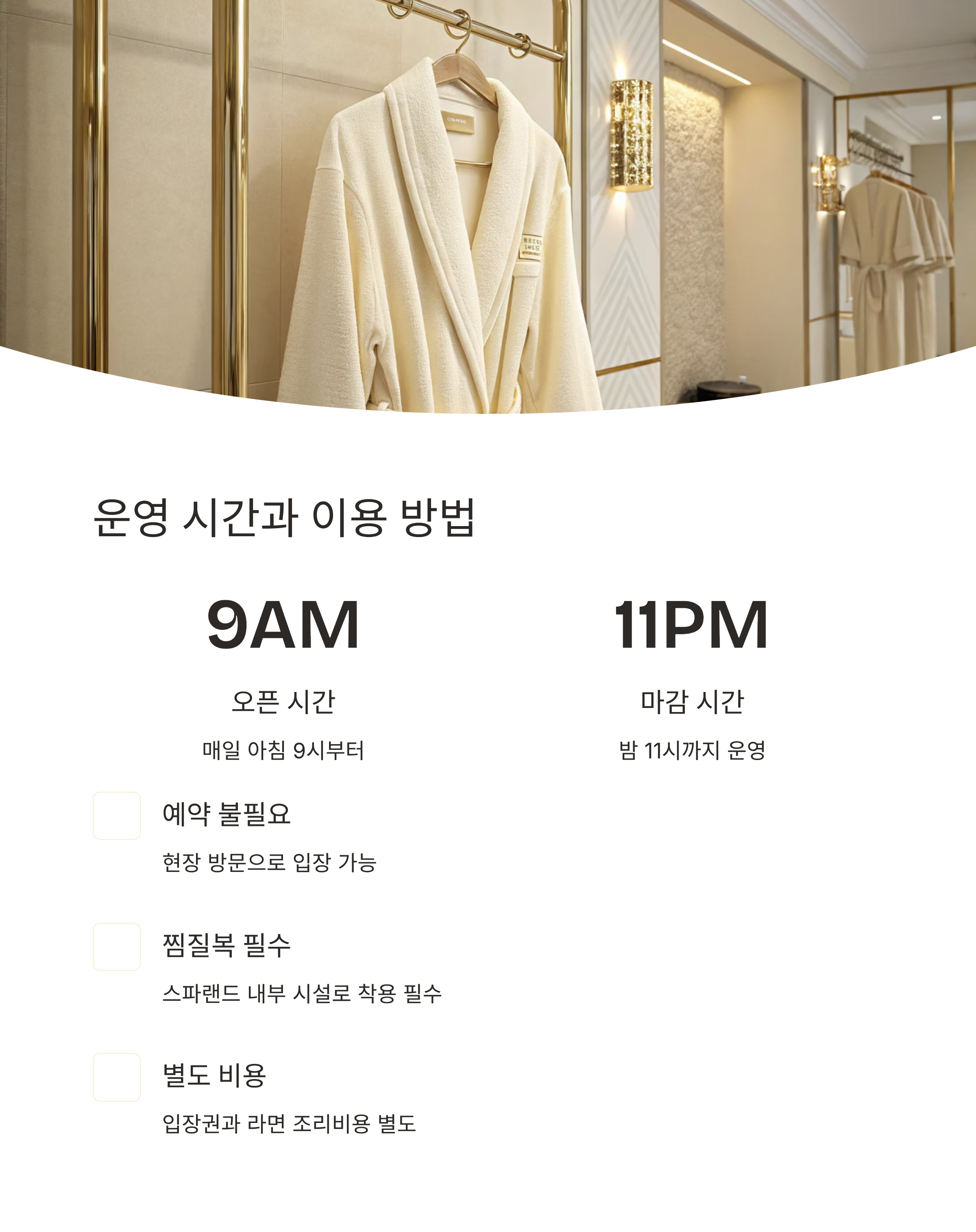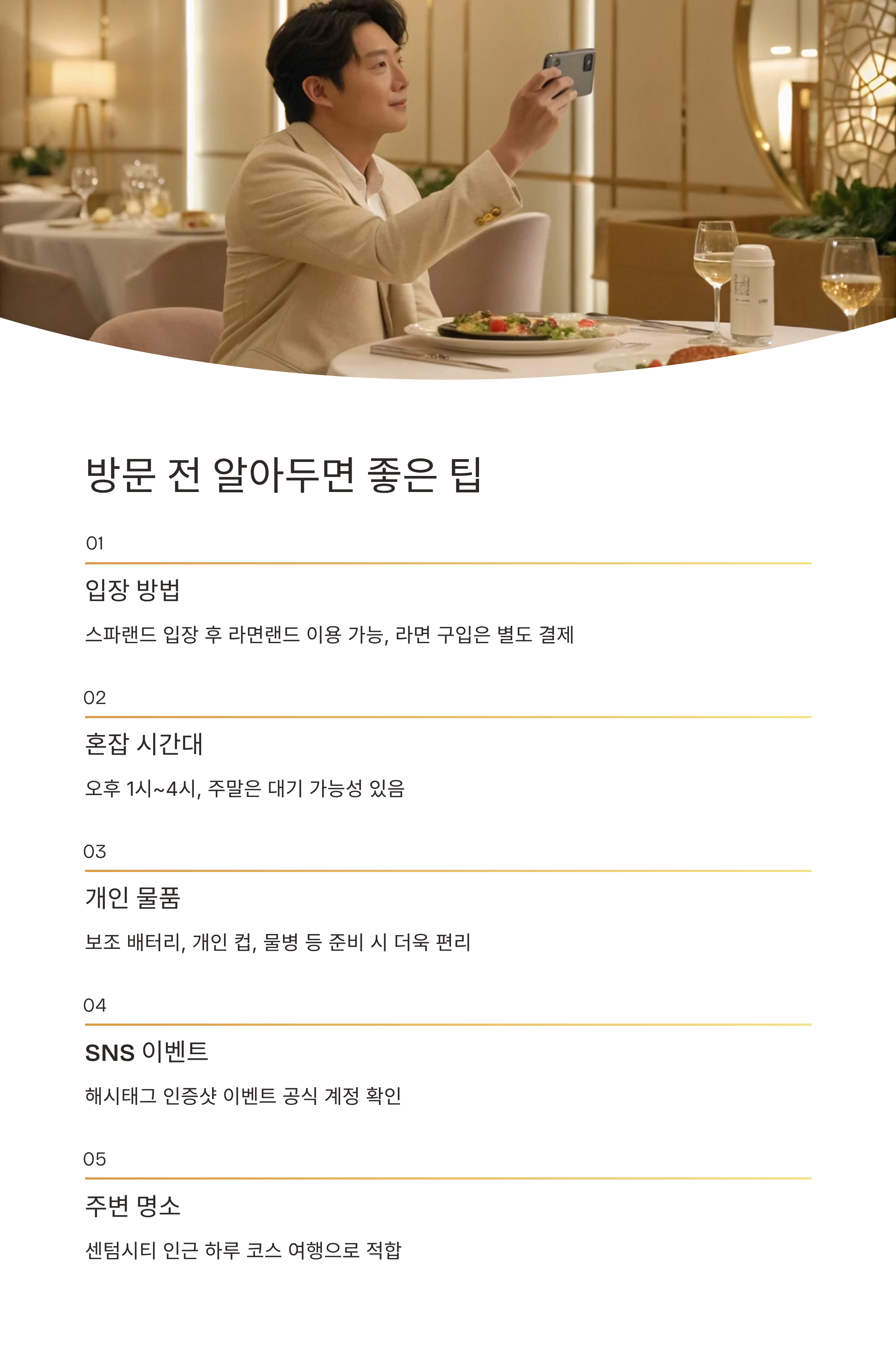 - 스파랜드 입장 후 라면랜드 이용 가능: 입장료는 스파랜드 기준, 라면 구입은 별도 결제