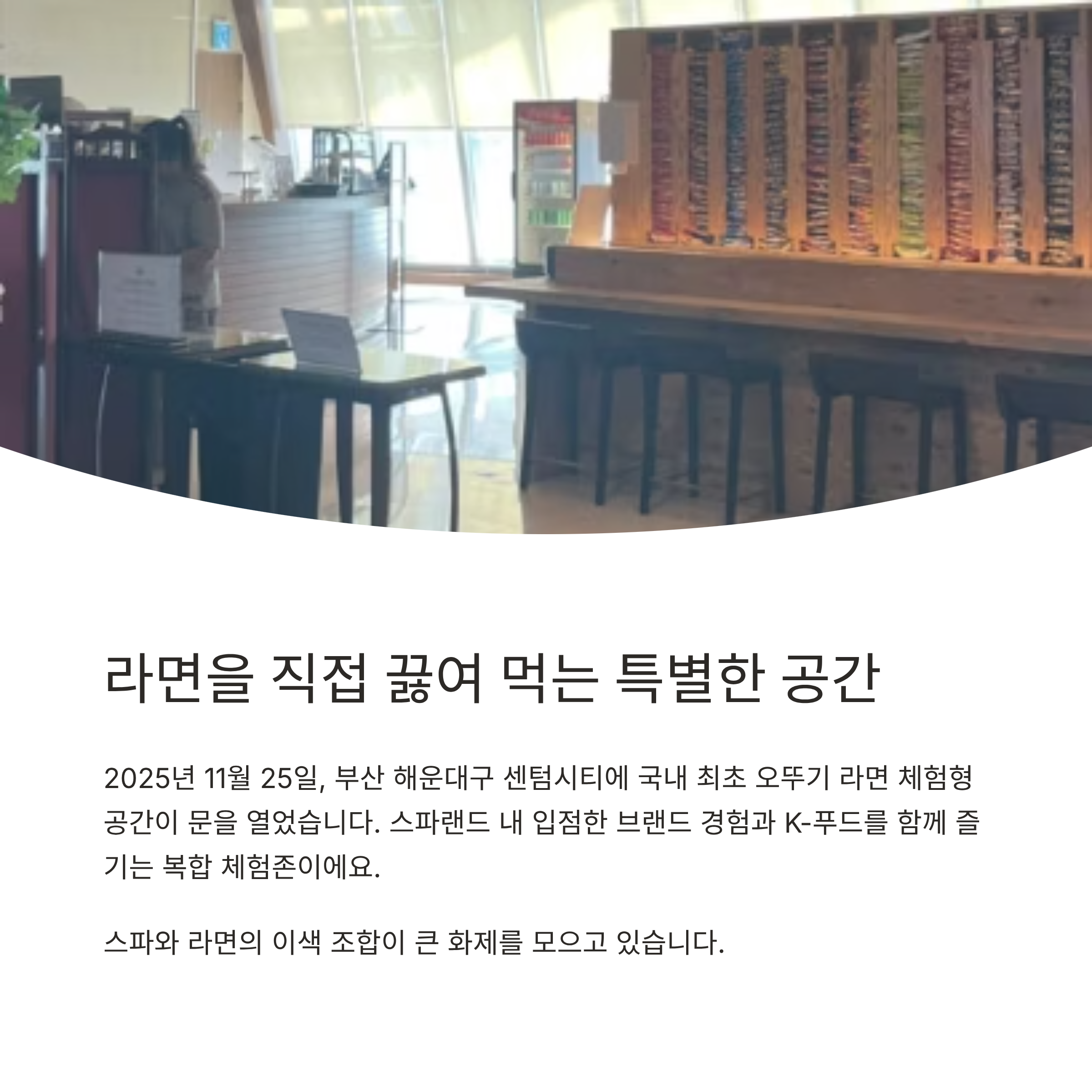 2025년 11월 25일, 부산 해운대구 센텀시티에 국내 최초 오뚜기 라면 체험형 공간 ‘오뚜기 라면랜드’가 문을 열었습니다. 단순한 식사 공간이 아닌, 브랜드 경험과 K-푸드를 함께 즐길 수 있는 복합 체험존으로, 센텀 스파랜드 내에 입점한 만큼 스파와 라면이라는 이색 조합이 큰 화제를 모으고 있어요. 본문에서는 오뚜기 라면랜드의 위치, 운영 시간, 체험 포인트, 주변 명소까지 상세하게 정리해드립니다.