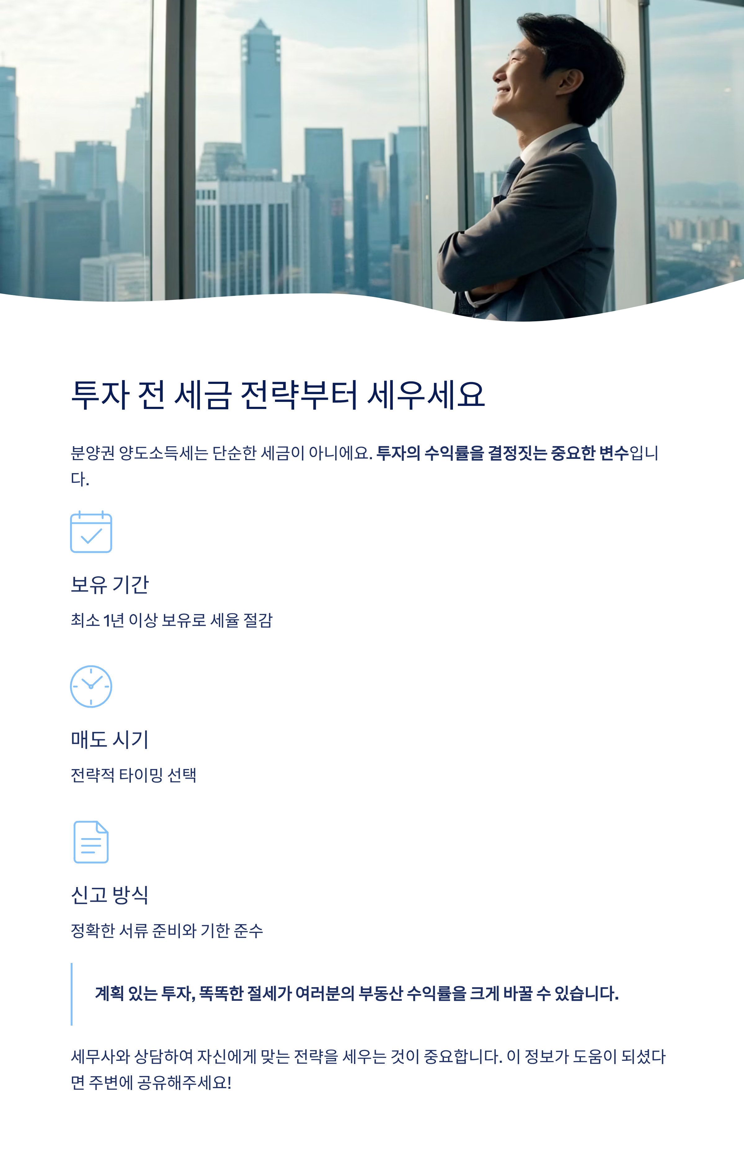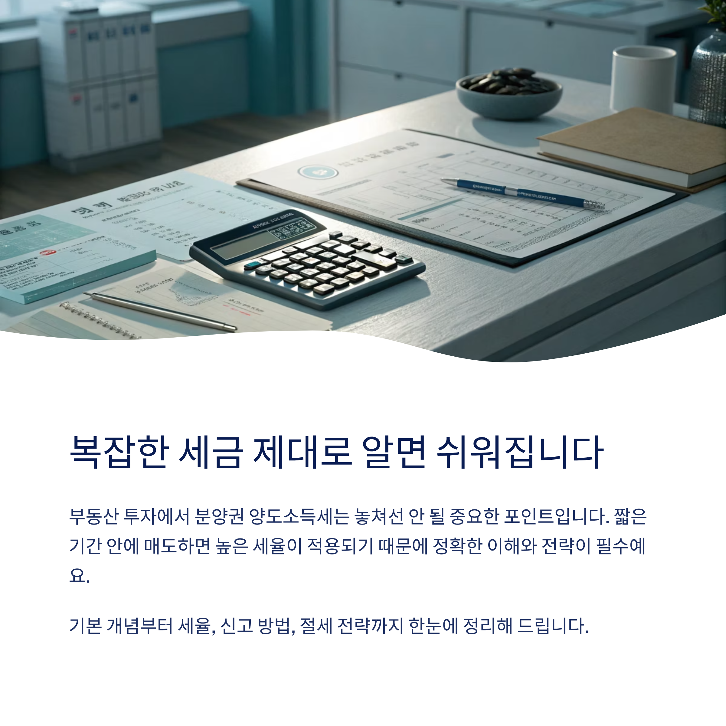 부동산 투자에서 ‘분양권 양도소득세’는 놓쳐선 안 될 중요한 포인트입니다. 특히 짧은 기간 안에 매도하는 경우 높은 세율이 적용되기 때문에, 정확한 이해와 전략이 필수인데요. 이번 글에서는 분양권 양도소득세의 기본 개념부터 세율, 신고 방법, 절세 전략까지 한눈에 정리해 드립니다.
