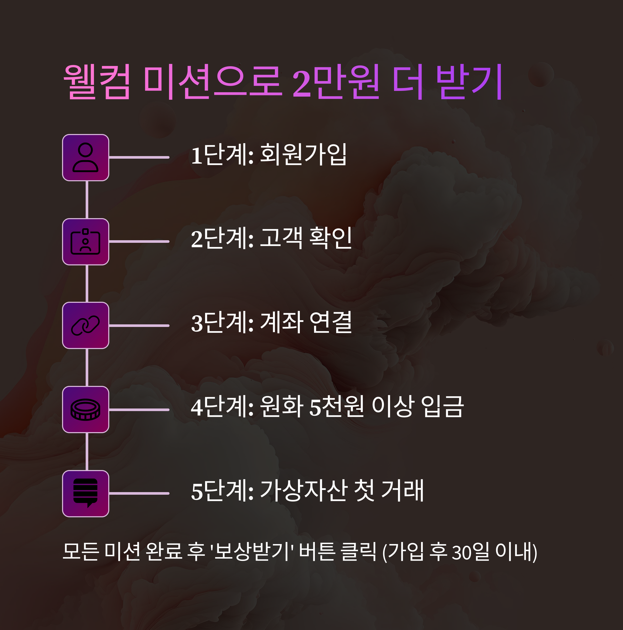 빗썸에서는 신규 가입자를 위한 웰컴 미션 5단계를 운영하고 있어요