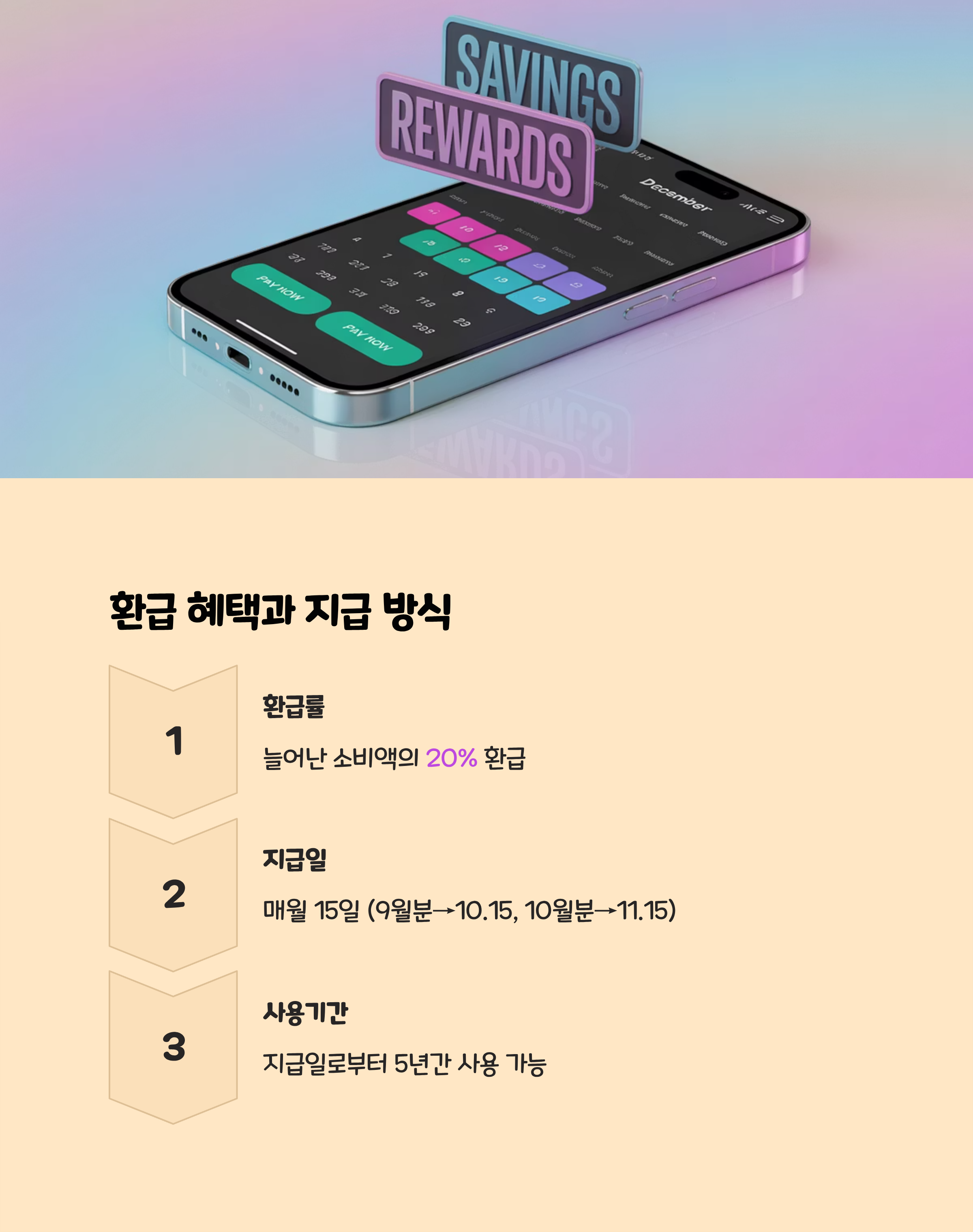 환급일은 매월 15일로, 9월 소비분은 10월 15일, 10월 소비분은 11월 15일에 지급됩니다.