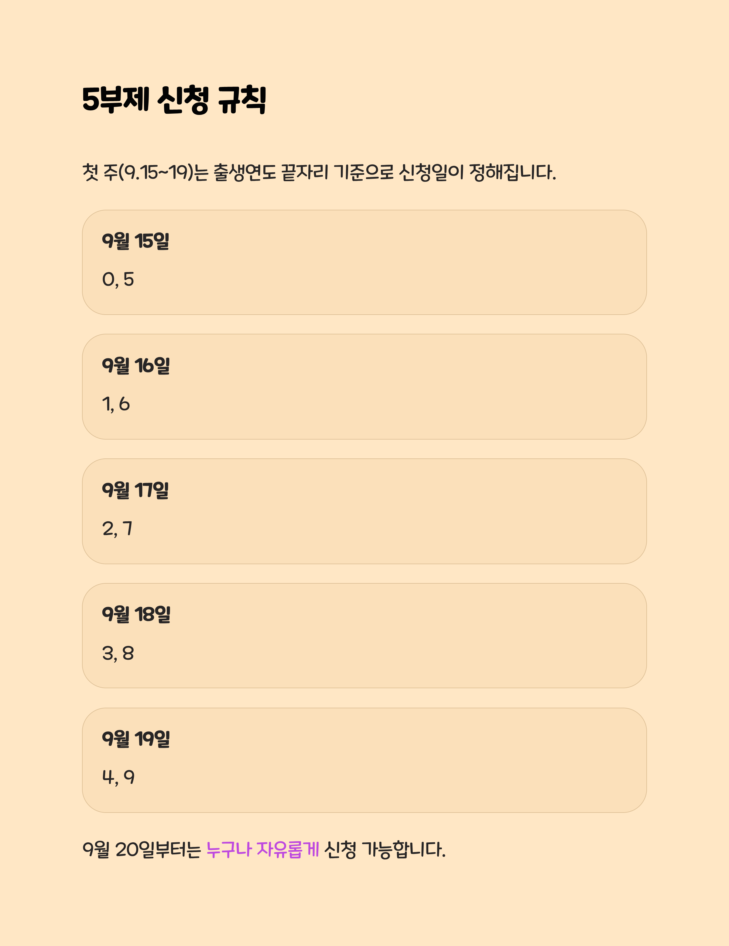 시작 첫 주(9월 15~19일)는 출생연도 끝자리 기준 5부제가 적용됩니다.