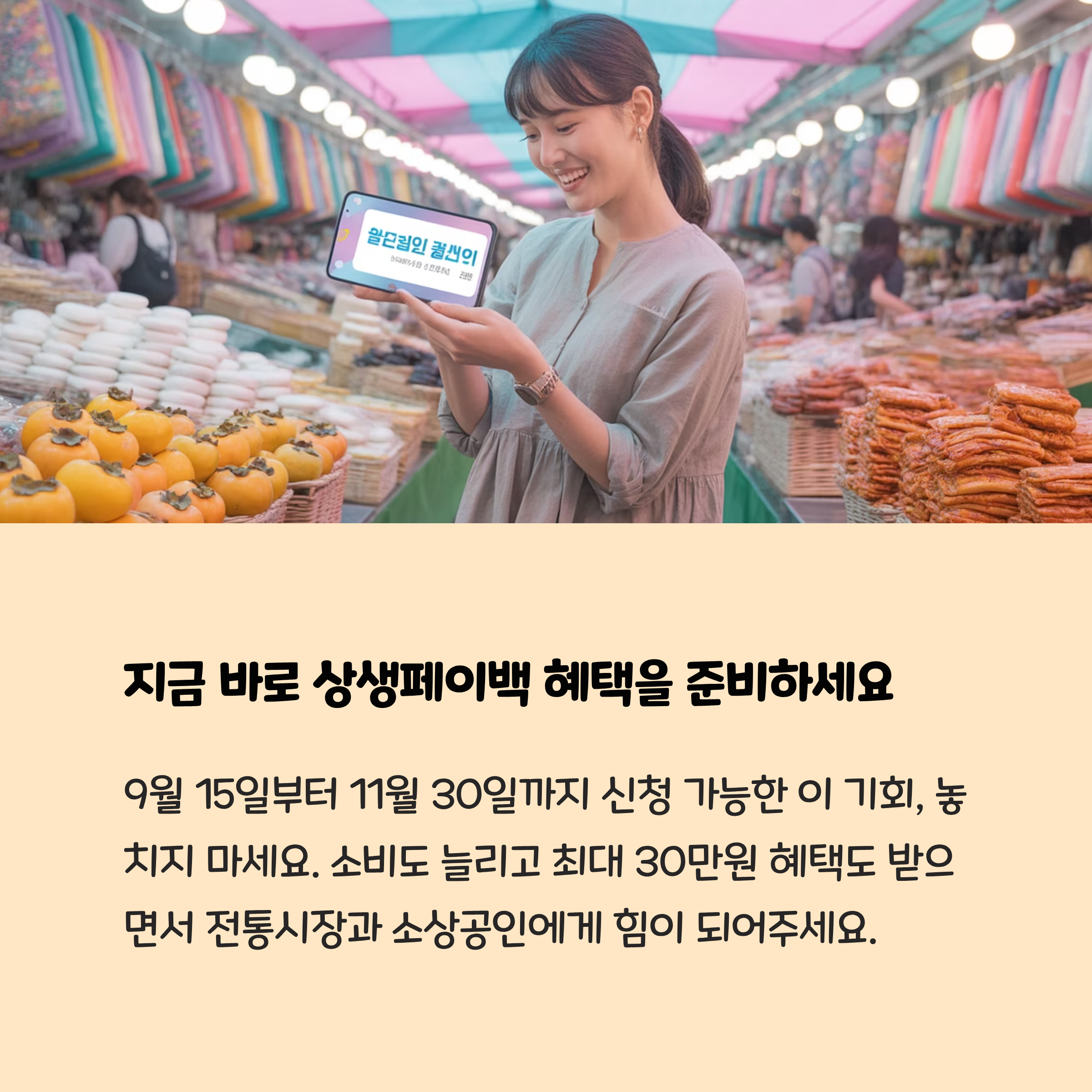 상생페이백은 단순히 개인의 환급 혜택을 넘어, 전통시장과 소상공인 살리기에 힘을 보태는 의미 있는 정책입니다.