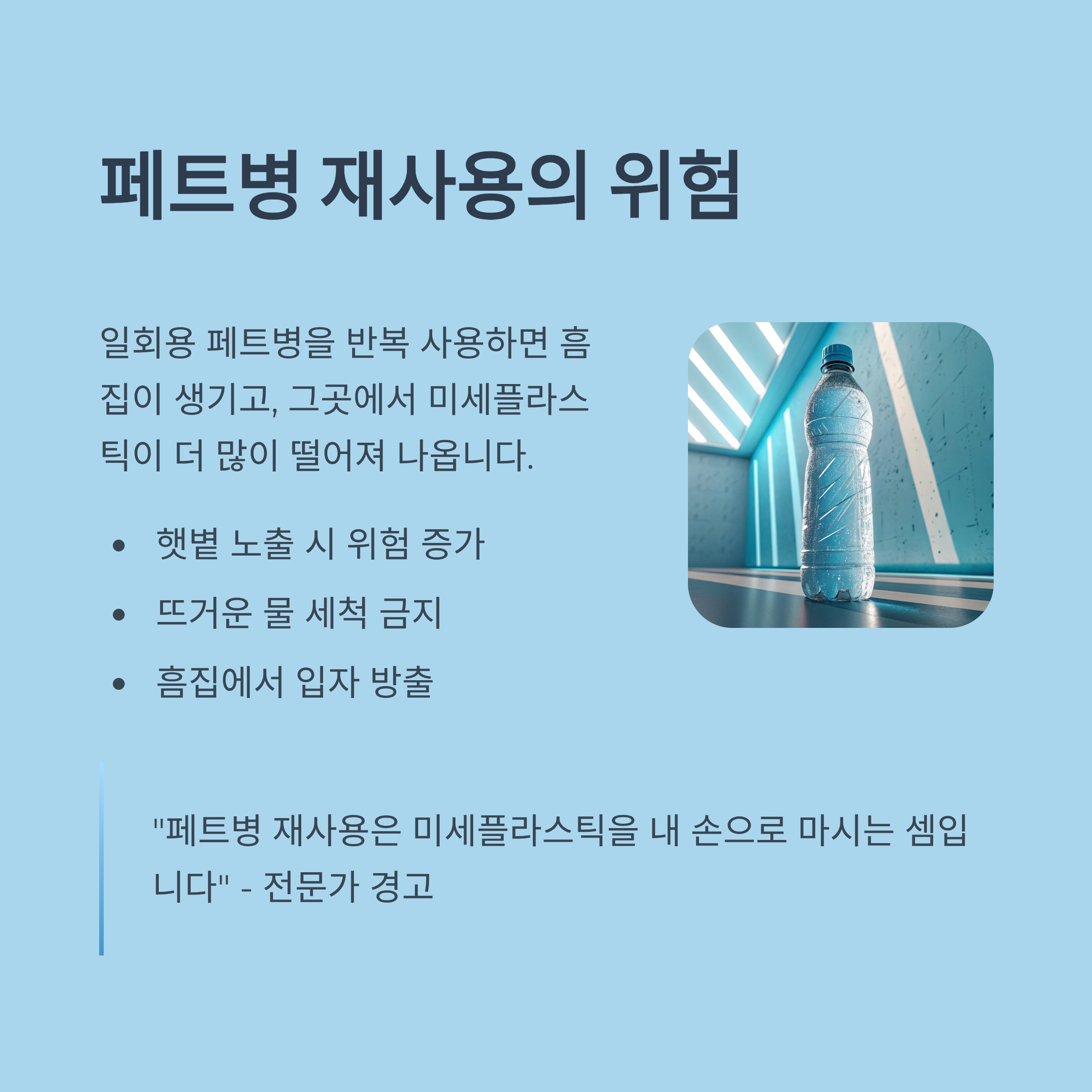 햇볕에 노출되거나 뜨거운 물로 세척하면 이 문제는 더 심각해져요. 전문가들은 "페트병 재사용은 미세플라스틱을 내 손으로 마시는 셈"이라고까지 말할 정도입니다.