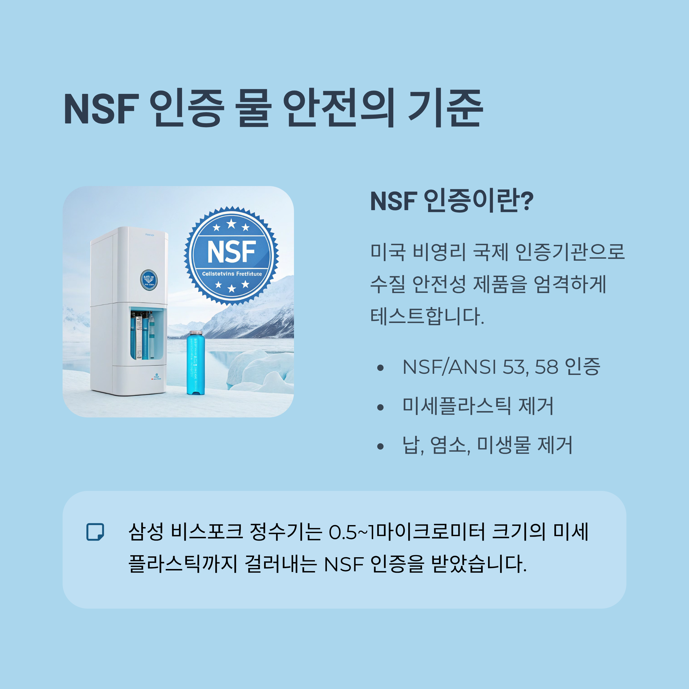 정수기나 필터 제품을 선택할 때 'NSF 인증' 마크가 있다면 한결 안심할 수 있어요. NSF는 미국의 비영리 국제 인증기관으로, 수질 안전성에 관련된 제품을 엄격하게 테스트하거든요.