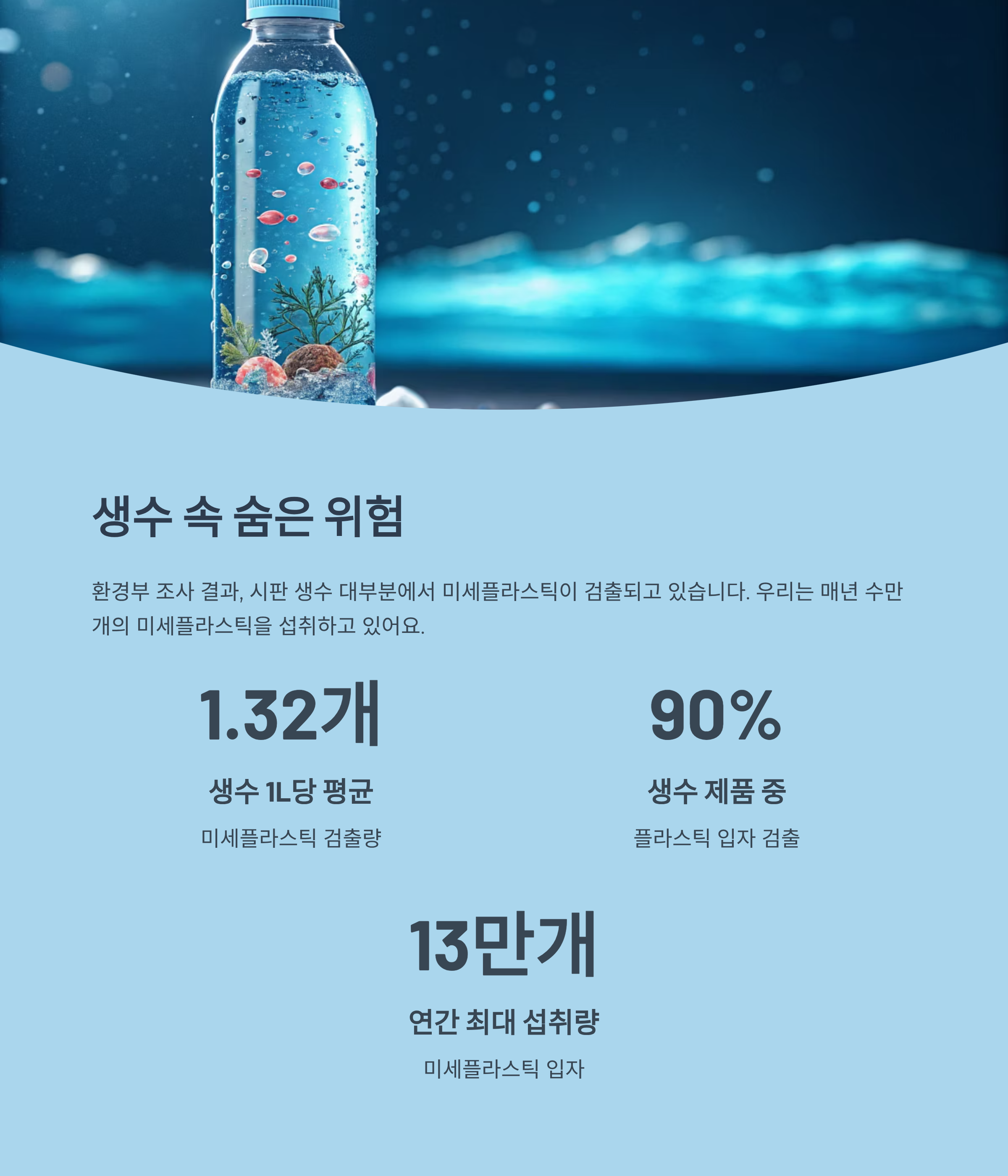 최근 환경부의 조사 결과는 충격적입니다. 시판 생수 1리터당 평균 1.32개의 미세플라스틱이 검출됐고, 생수 제품 10개 중 9개에서 플라스틱 입자가 나왔다는 사실. 생수가 더 이상 완벽하게 깨끗한 물이 아니라는 거죠.