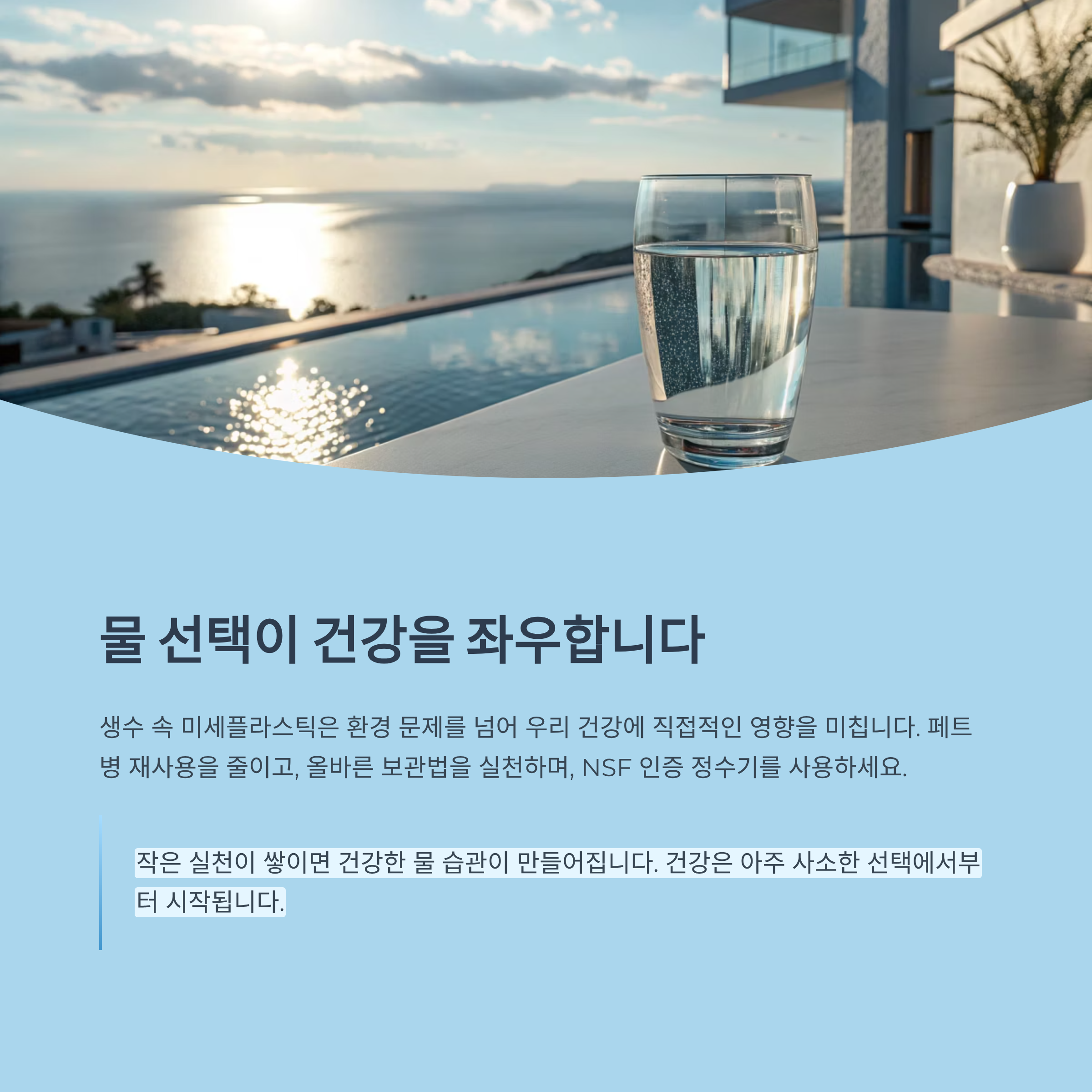 작은 실천이 쌓이면 건강한 물 습관이 만들어집니다. 지금부터라도 생수를 고를 때 조금 더 꼼꼼히 살펴보고, 매일 마시는 물에 대한 기준을 바꿔보세요. 건강은 아주 사소한 선택에서부터 시작됩니다.