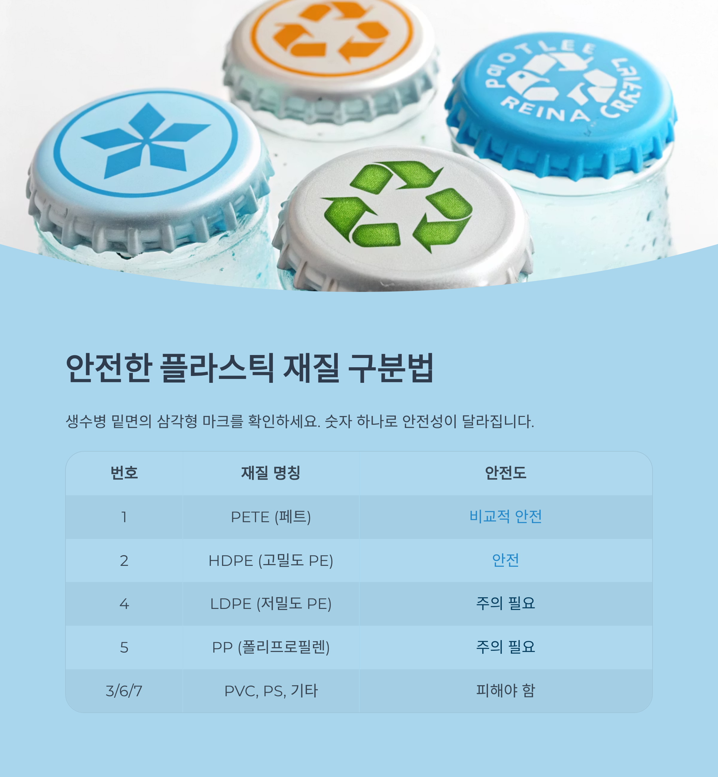 | 1 | PETE(페트) | 비교적 안전 |