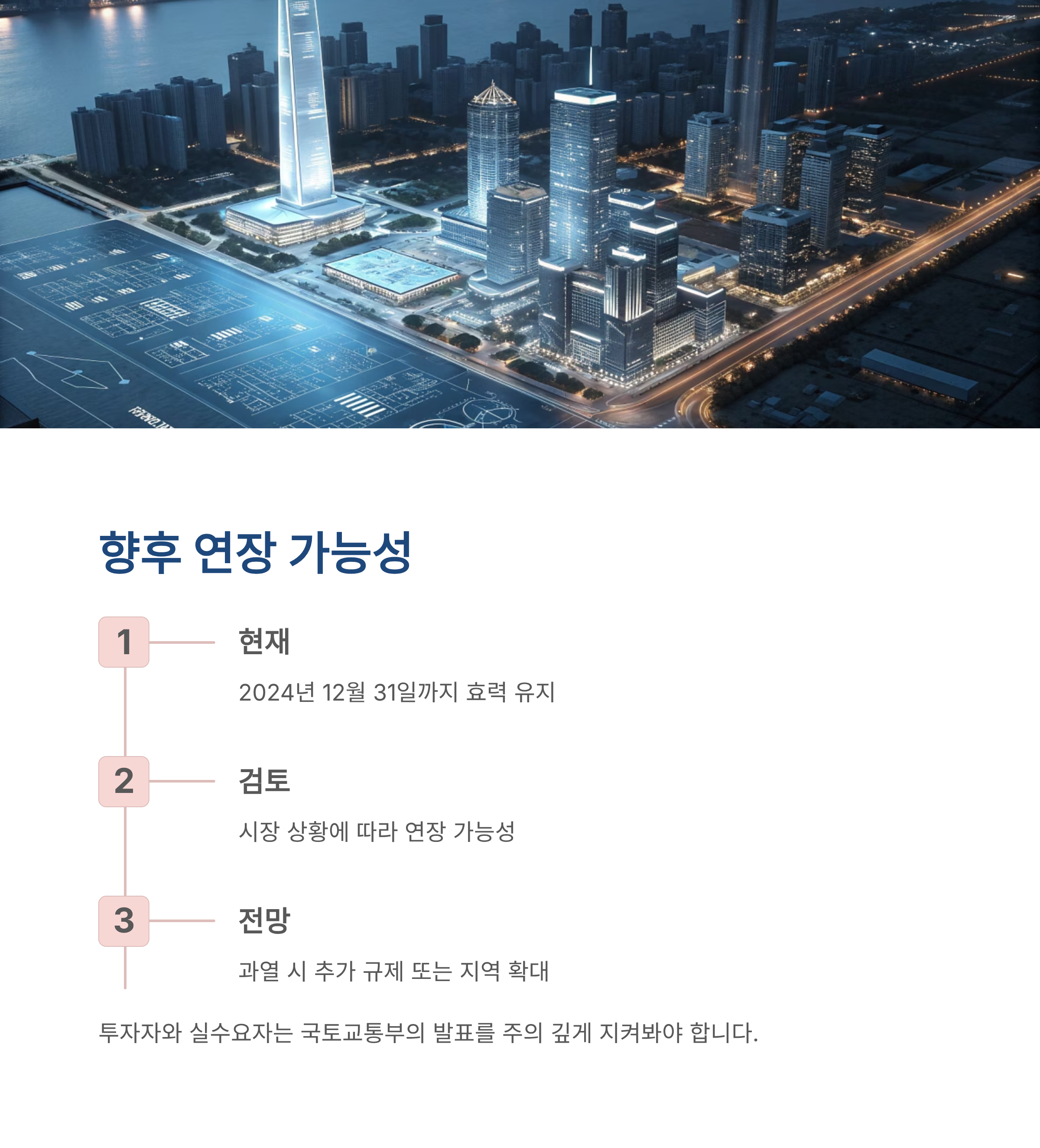 현재 지정된 서울·경기 토지거래허가구역은 2024년 12월 31일까지 효력이 유지되며, 부동산 시장 상황에 따라 연장될 수도 있습니다. 정부는 시장 과열이 다시 감지될 경우 추가 규제나 지역 확대 가능성을 시사하고 있습니다.
