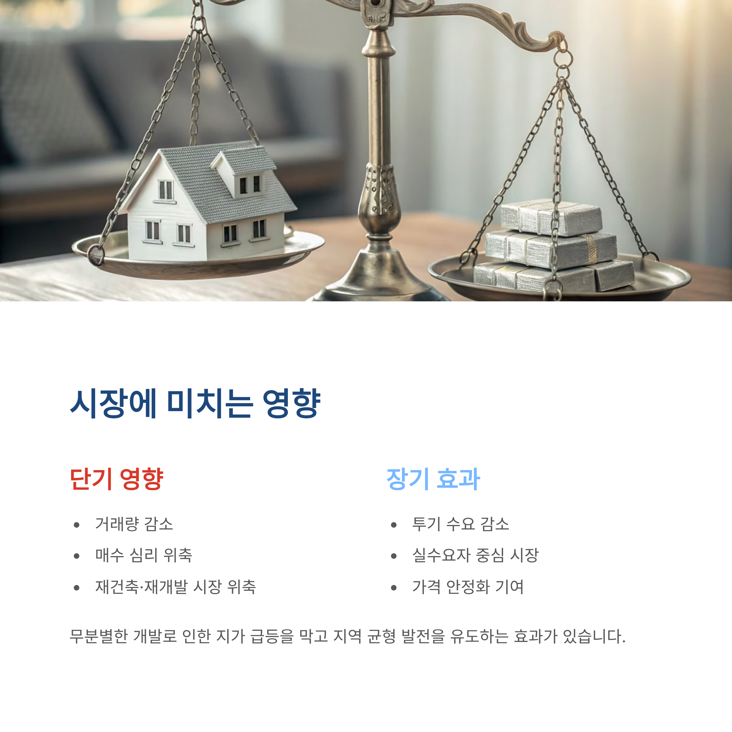 토지거래허가구역 지정은 단기적으로 거래량 감소와 매수 심리 위축을 초래하지만, 장기적으로는 투기 수요를 줄이고 실수요자 중심의 시장을 만드는 데 기여합니다. 또한 무분별한 개발로 인한 지가 급등을 막고 지역 균형 발전을 유도하는 효과도 있습니다.