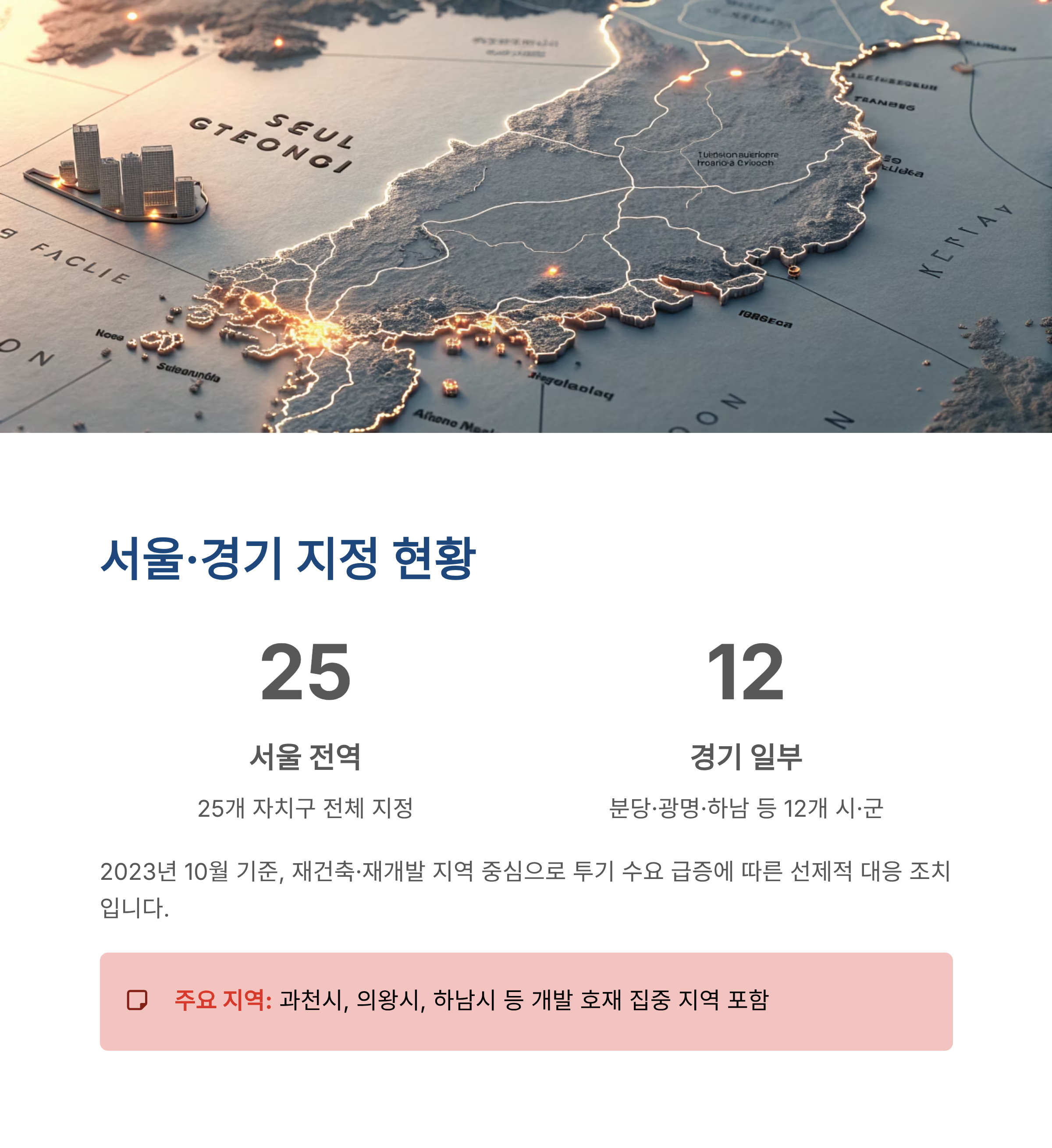 2023년 10월 기준으로 서울 전역(25개 자치구 전체)과 경기 일부 지역이 토지거래허가구역으로 지정되었습니다. 경기도에서는 분당구, 광명시, 하남시, 과천시, 의왕시 등 12개 시·군이 포함되어 있습니다. 이는 재건축, 재개발 지역을 중심으로 투기 수요가 급증하자 정부가 선제적으로 대응한 조치입니다.