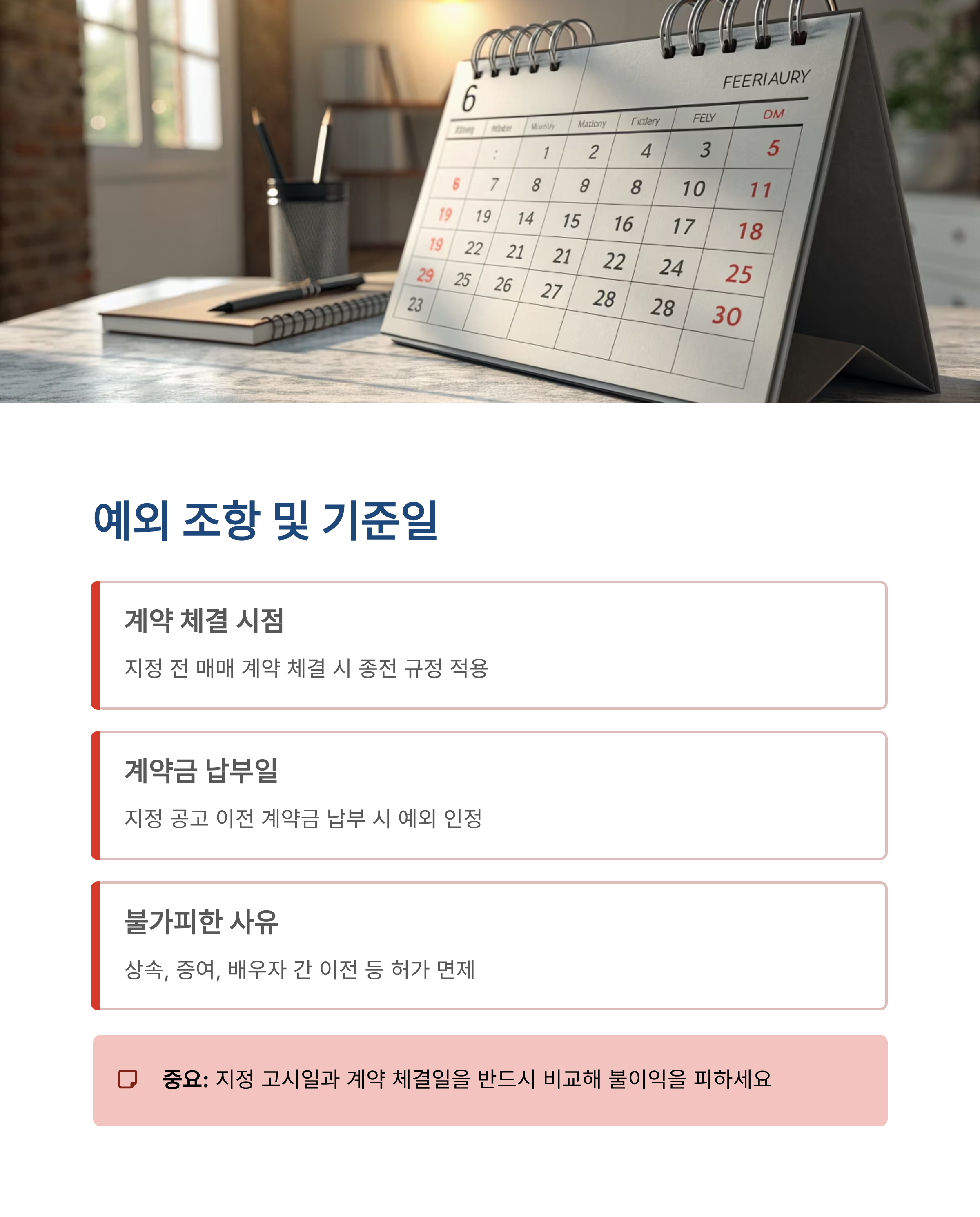 토지거래허가구역 지정 전 매매 계약을 체결했거나, 지정 공고 이전에 계약금을 납부한 경우에는 종전 규정을 적용받을 수 있습니다. 또한 상속, 증여, 배우자 간 이전 등 불가피한 사유가 있는 경우에는 허가 의무가 면제될 수 있습니다.