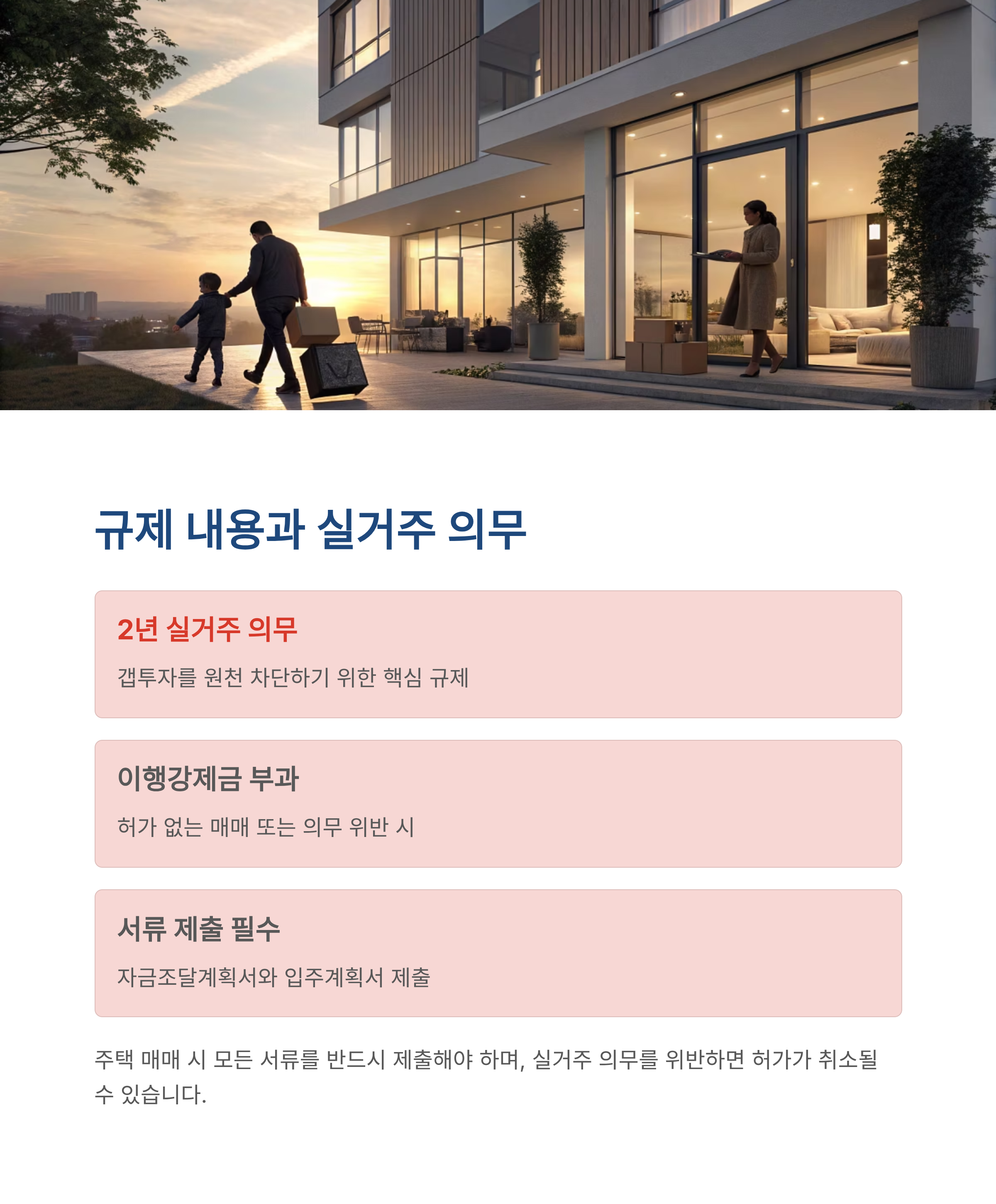 토지거래허가구역으로 지정되면 ‘2년 실거주 의무’가 생깁니다. 이는 갭투자(전세를 끼고 주택을 구입하는 투자 형태)를 원천 차단하기 위한 장치입니다.