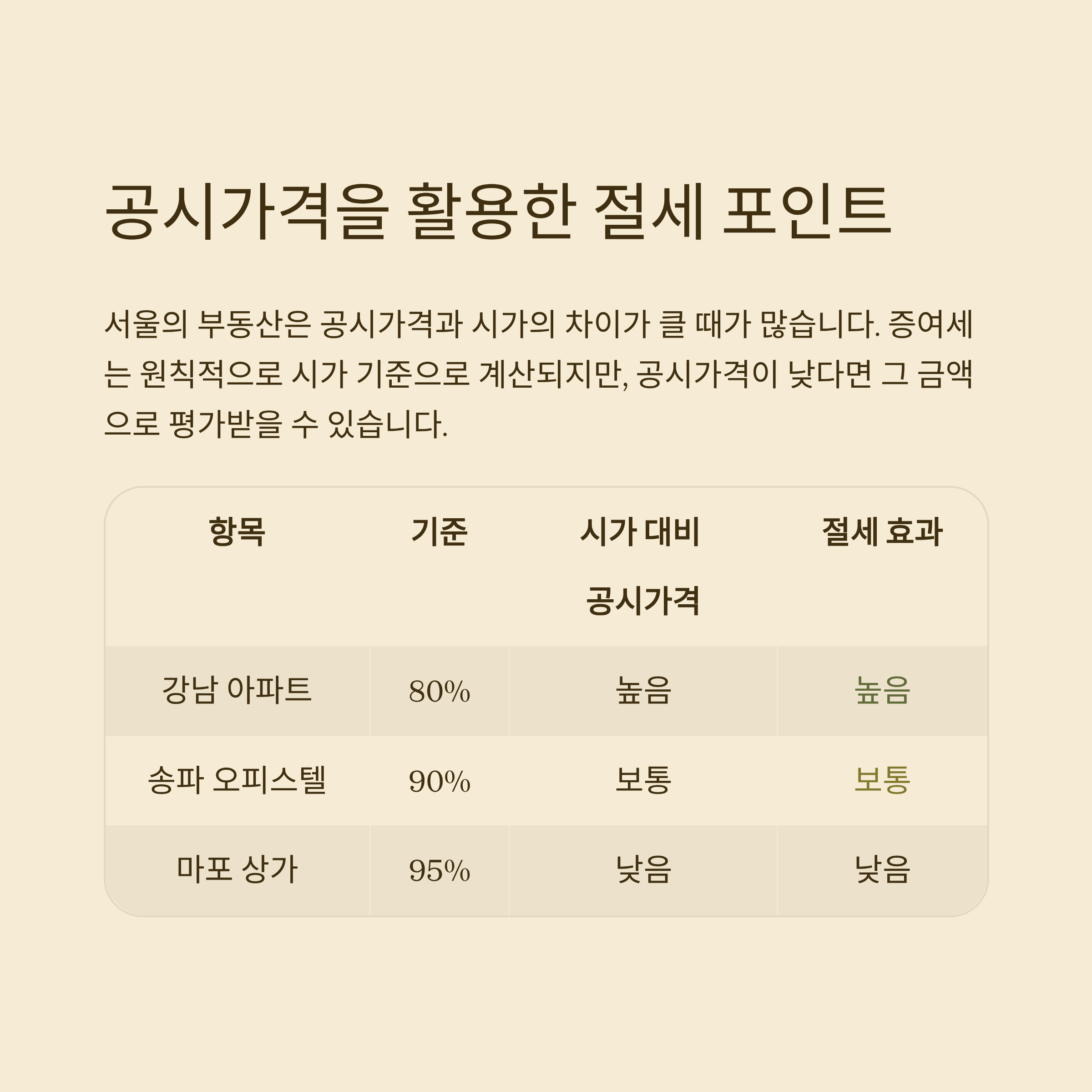 | 항목 | 기준 시가 대비 공시가격 | 절세 효과 |
