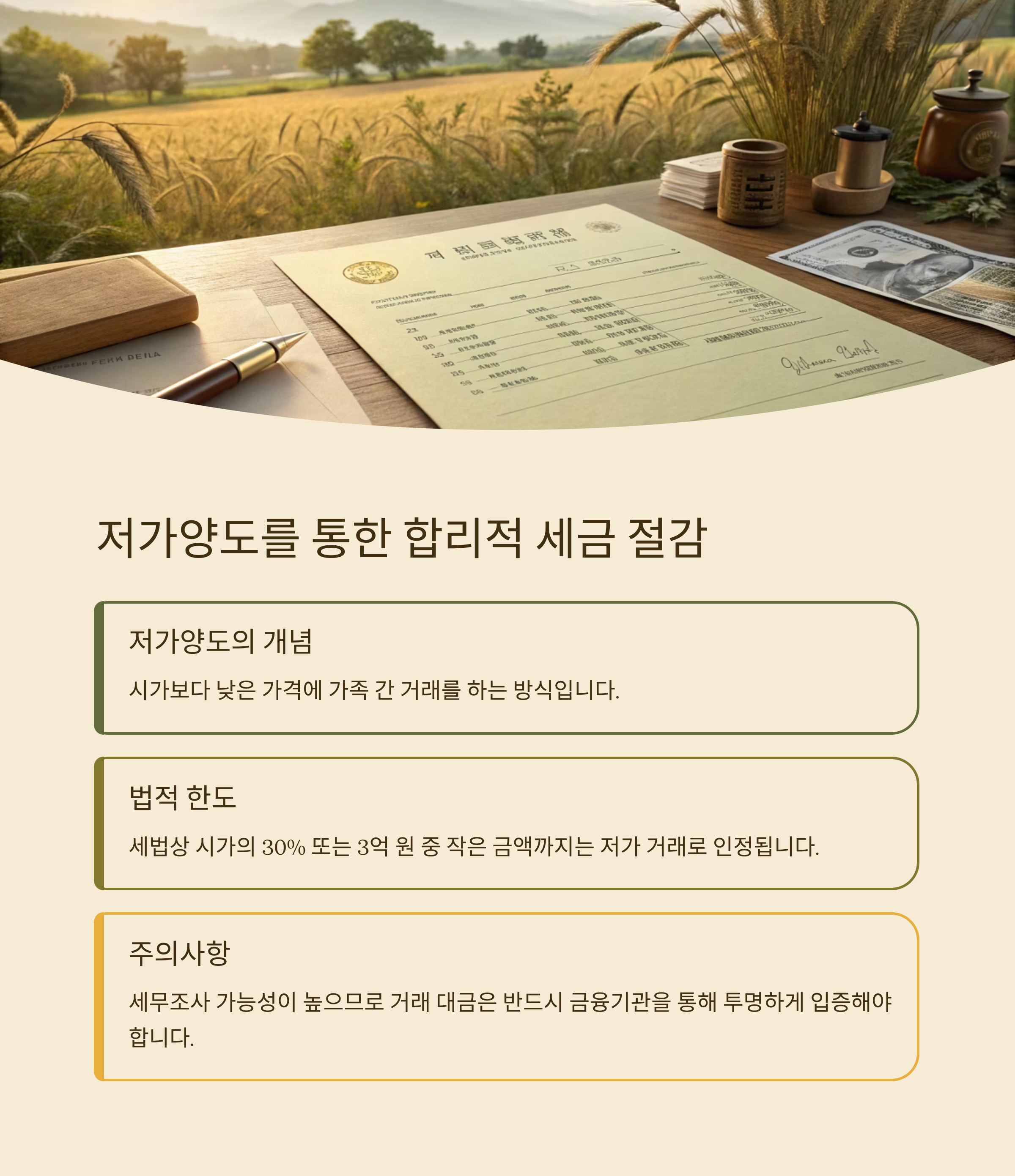 저가양도는 시가보다 낮은 가격에 가족 간 거래를 하는 방식입니다. 세법상 시가의 30% 또는 3억 원 중 작은 금액까지는 저가 거래로 인정되지만, 세무조사 가능성이 높습니다. 거래 대금은 반드시 금융기관을 통해 투명하게 입증해야 합니다.