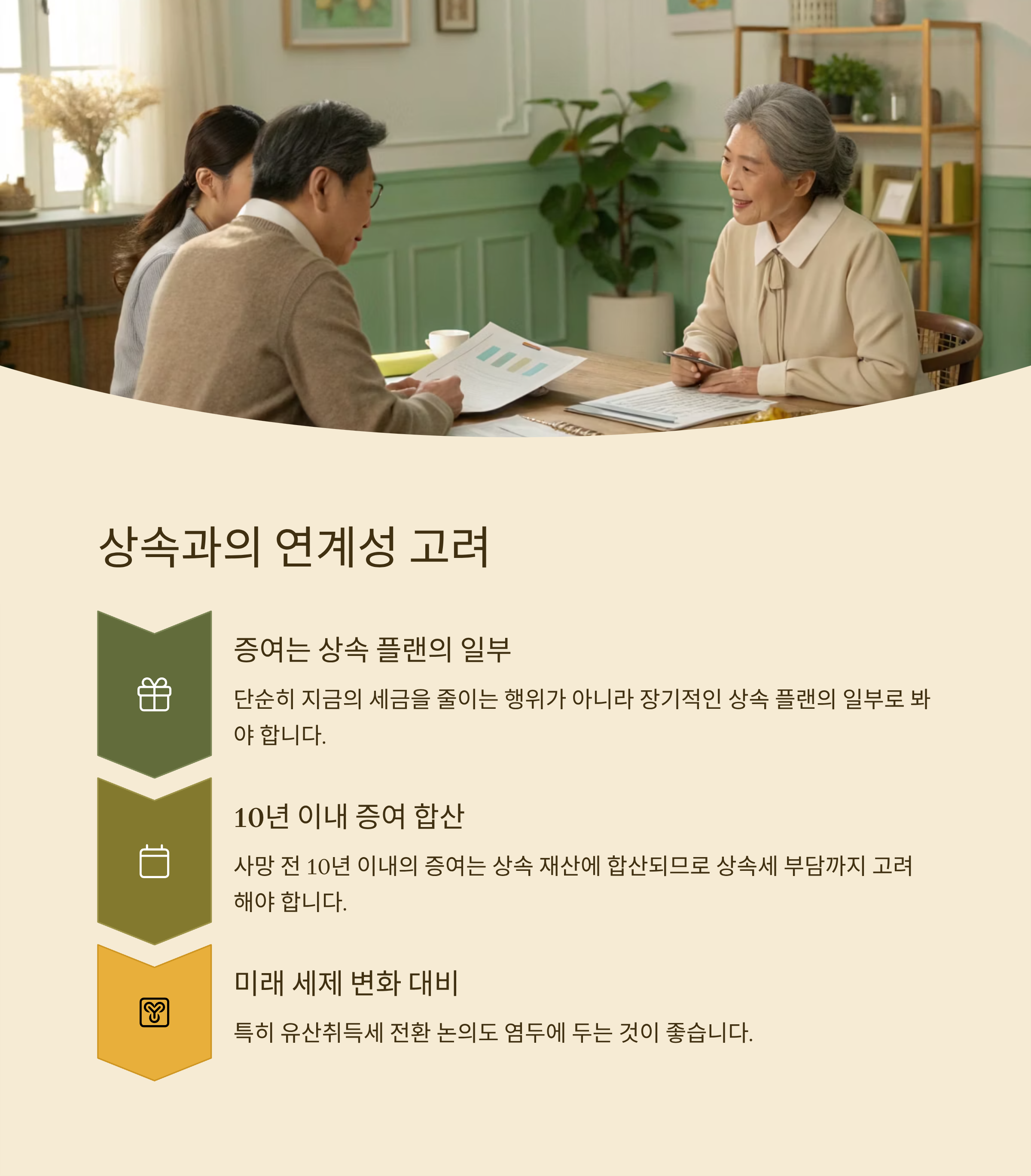 증여는 단순히 지금의 세금을 줄이는 행위가 아니라, 장기적인 상속 플랜의 일부로 봐야 합니다. 사망 전 10년 이내의 증여는 상속 재산에 합산되므로, 상속세 부담까지 고려해야 합니다. 미래의 세제 변화 가능성, 특히 유산취득세 전환 논의도 염두에 두는 것이 좋습니다.