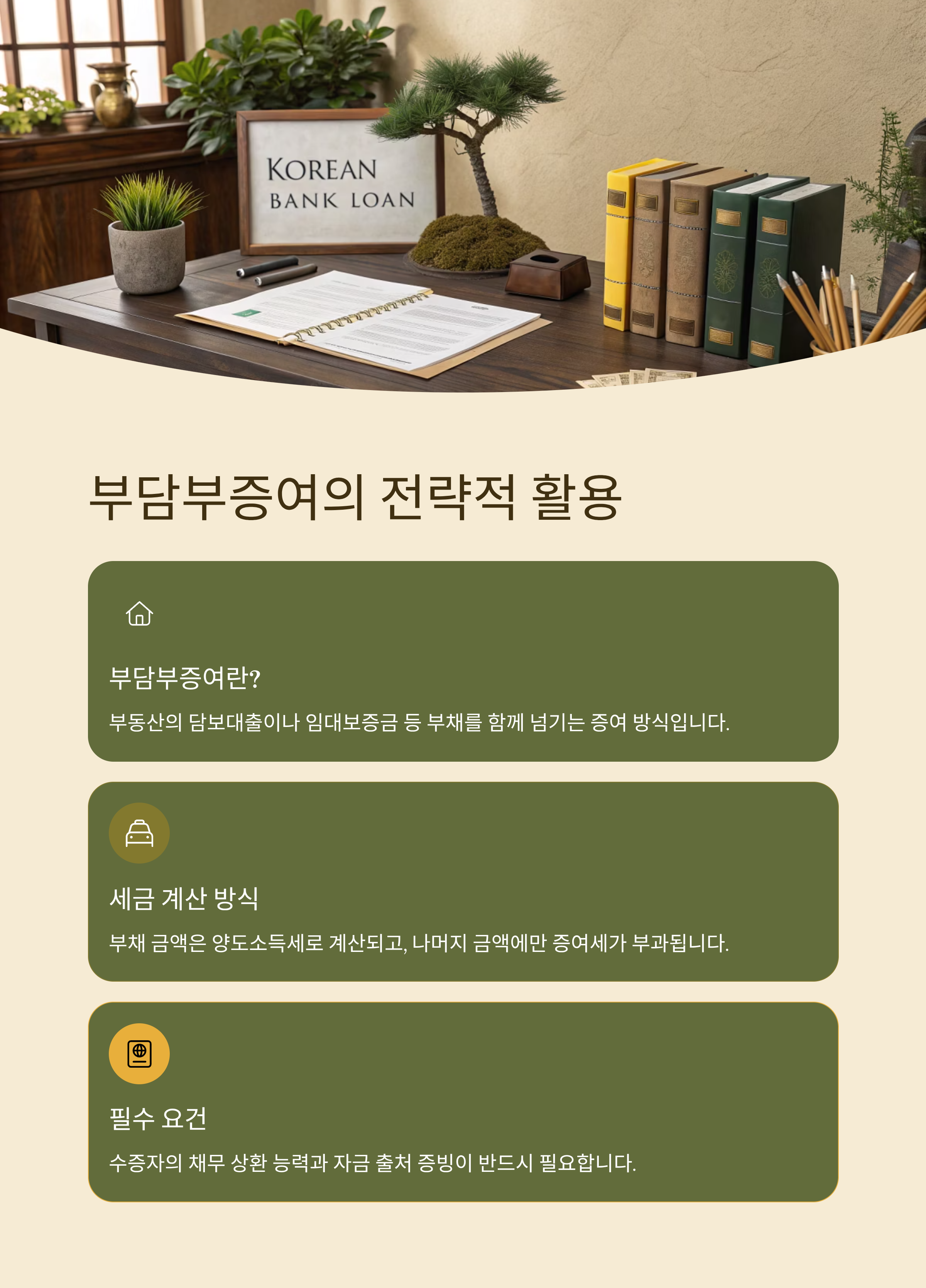 부담부증여란, 부동산의 담보대출이나 임대보증금 등 부채를 함께 넘기는 증여 방식을 말합니다. 이 경우 부채에 해당하는 금액은 양도소득세로 계산되고, 나머지 금액에만 증여세가 부과됩니다. 단, 수증자가 실제로 채무를 상환할 능력이 있어야 하고, 자금 출처 증빙이 필요합니다.