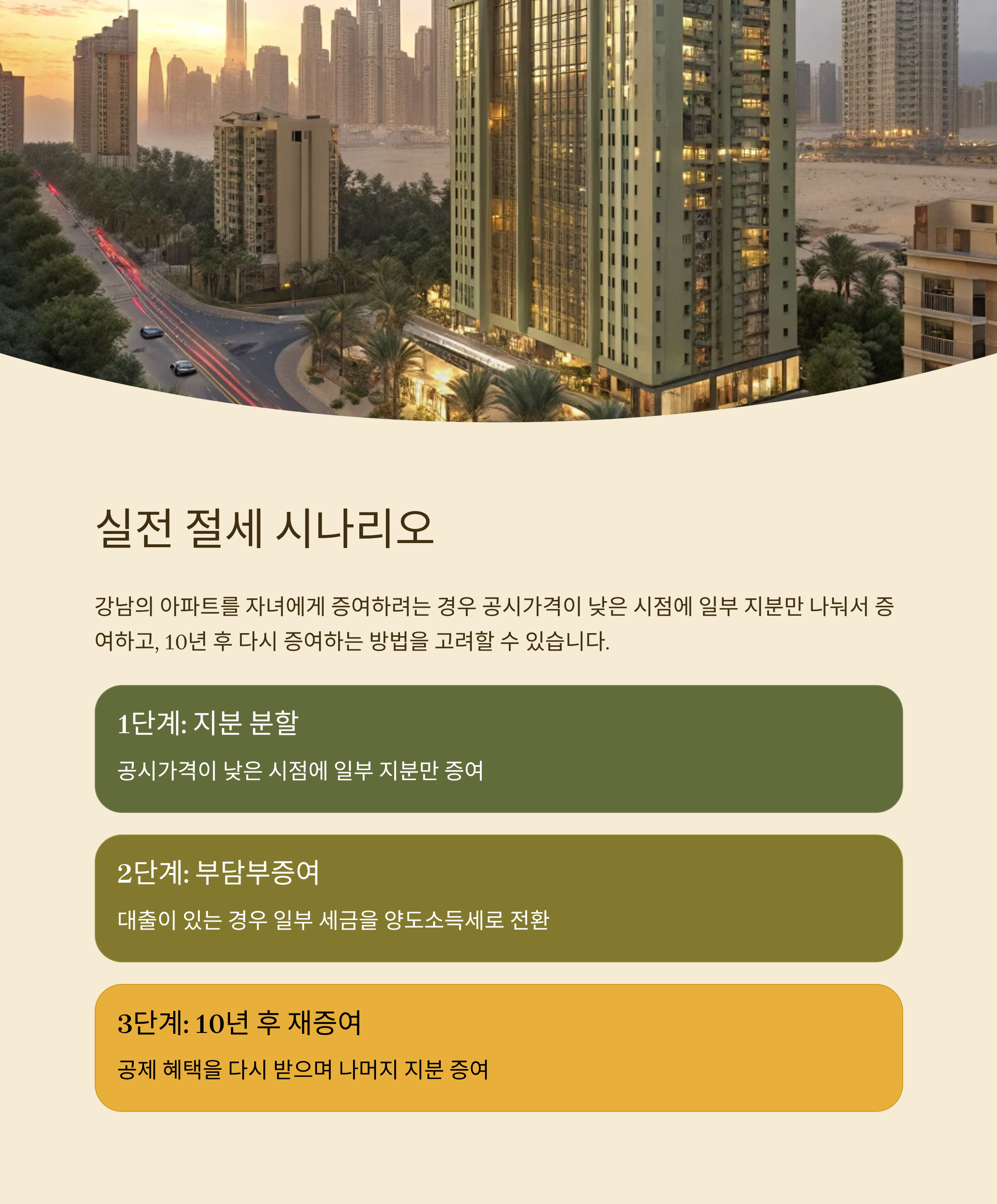 예를 들어, 강남의 아파트를 자녀에게 증여하려는 경우 공시가격이 낮은 시점에 일부 지분만 나눠서 증여하고, 10년 후 다시 증여하는 방법을 고려할 수 있습니다. 또 대출이 있는 경우 부담부증여로 일부 세금을 양도소득세로 전환하면 전체 세 부담이 줄어듭니다.