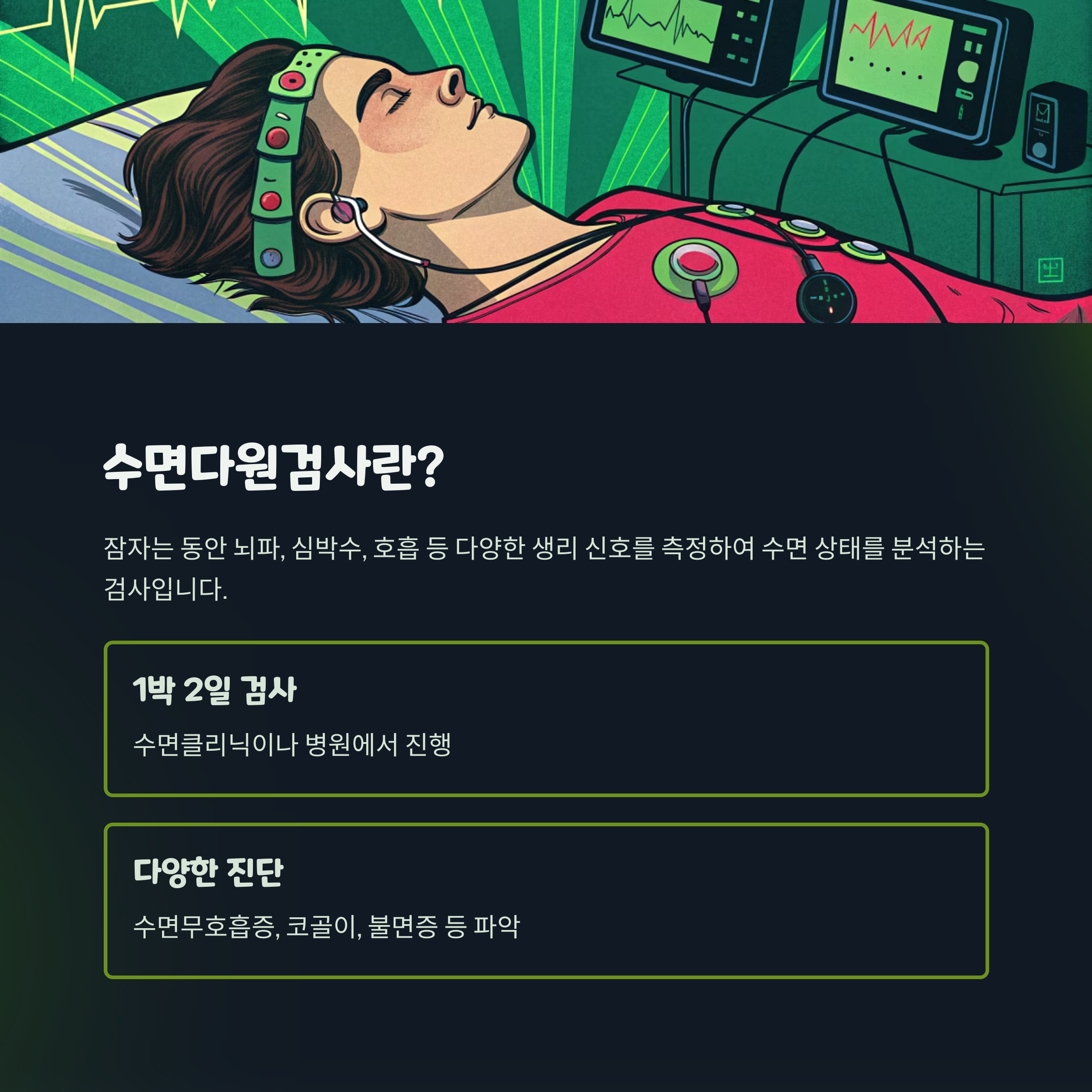 이 검사는 수면무호흡증, 코골이, 불면증, 하지불안증후군 등