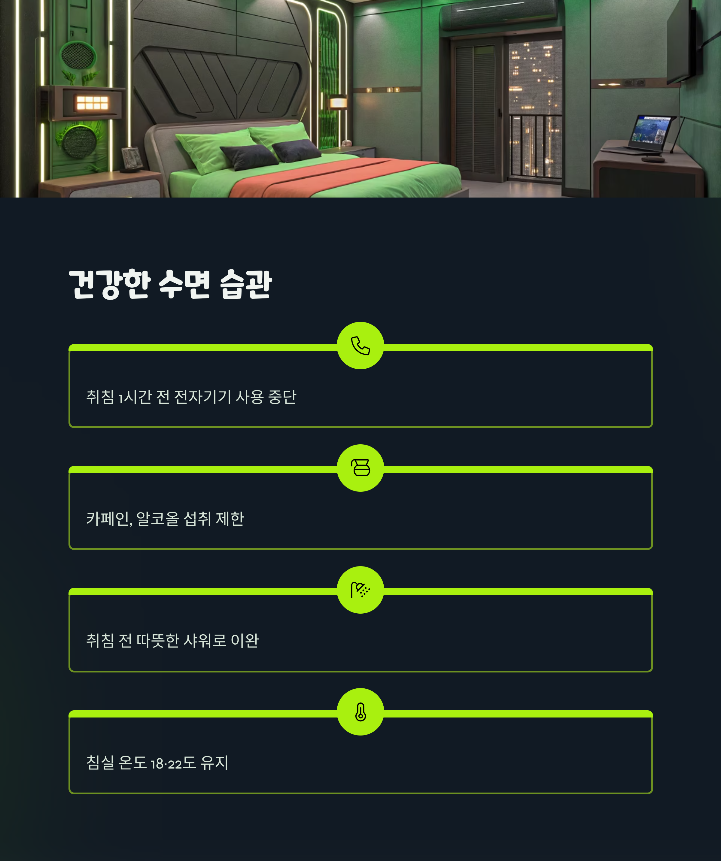 | 침실 환경 최적화 | 온도(18~22도), 조도, 소음 최소화 등 |