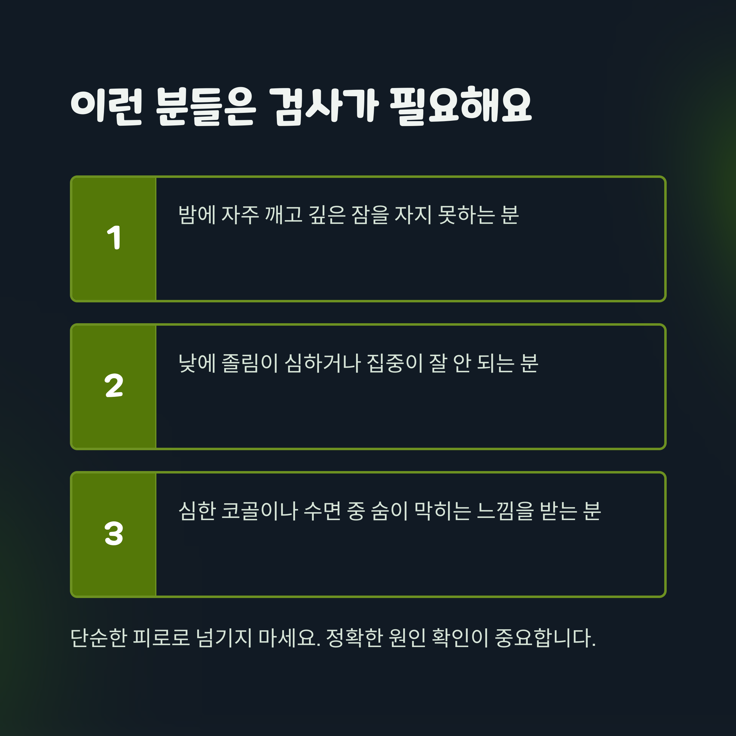 - 심한 코골이나 수면 중 숨이 막히는 느낌을 자주 받는 분