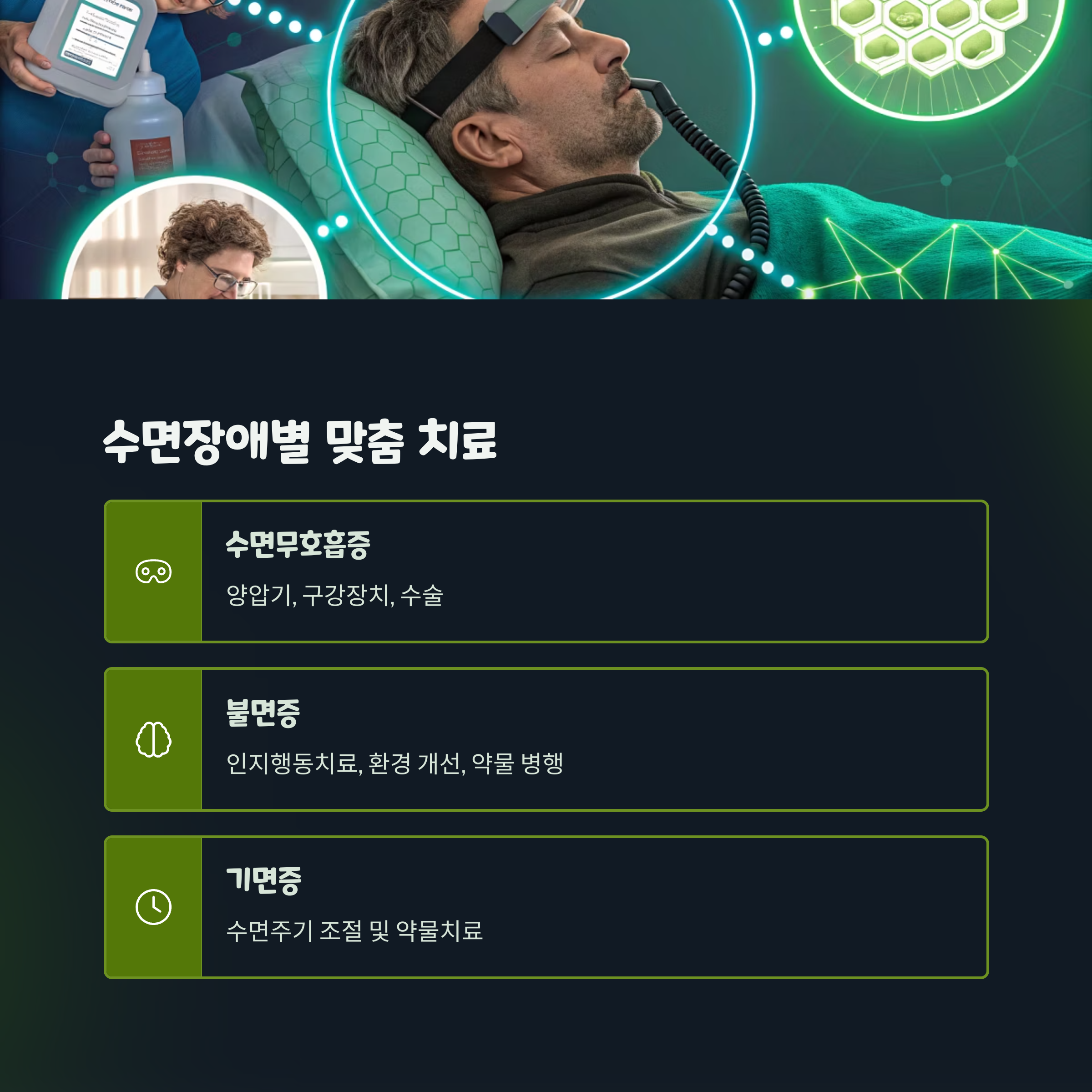 - 불면증: 인지행동치료, 환경 개선, 약물 병행
