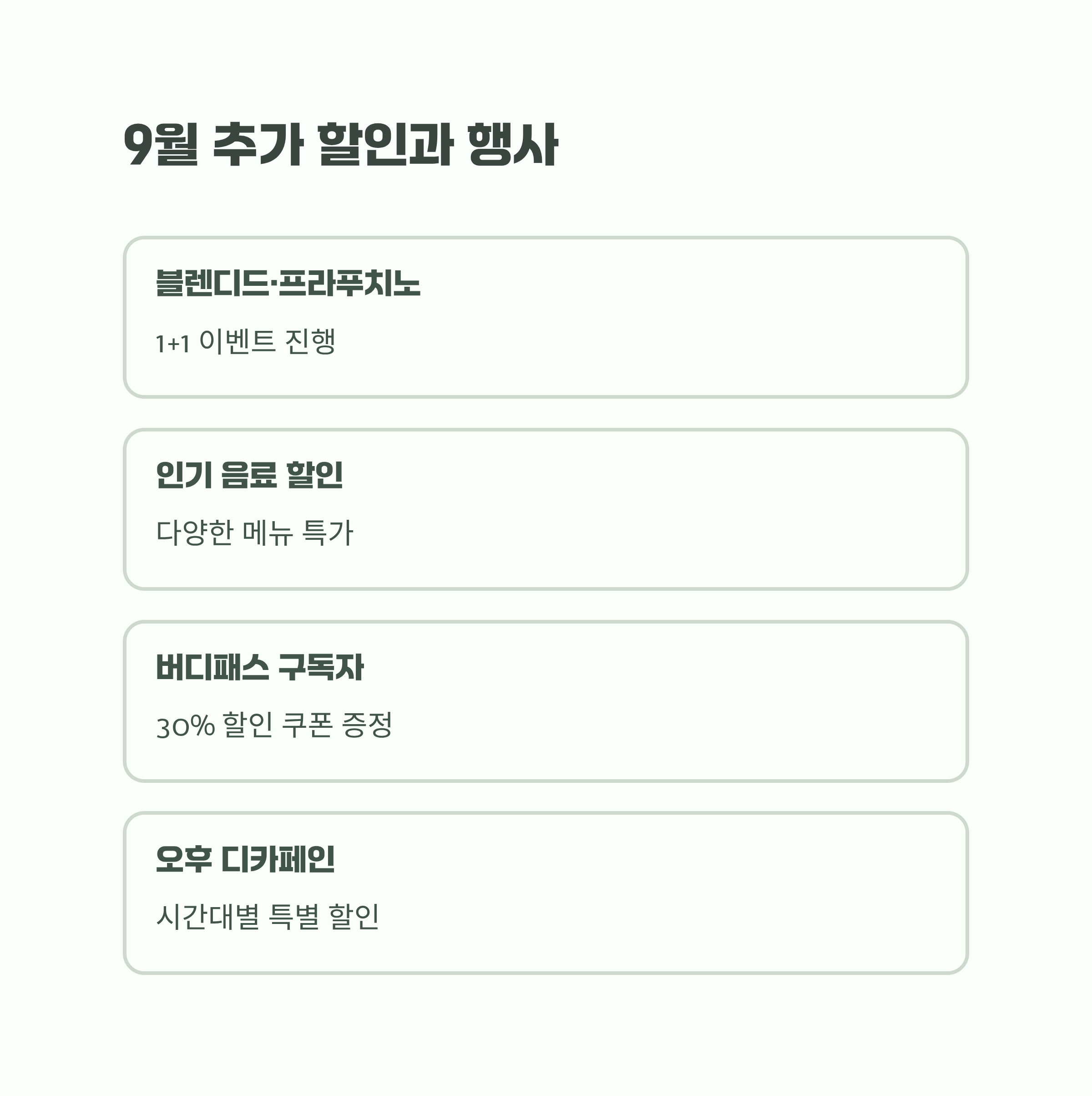 이달에는 블렌디드·프라푸치노 1+1, 인기 음료 할인, 버디패스 구독자 30% 할인 쿠폰 증정 등 다채로운 프로모션이 진행되었습니다. 특히 오후 시간대 디카페인 음료 할인은 고객 만족도가 높았습니다.