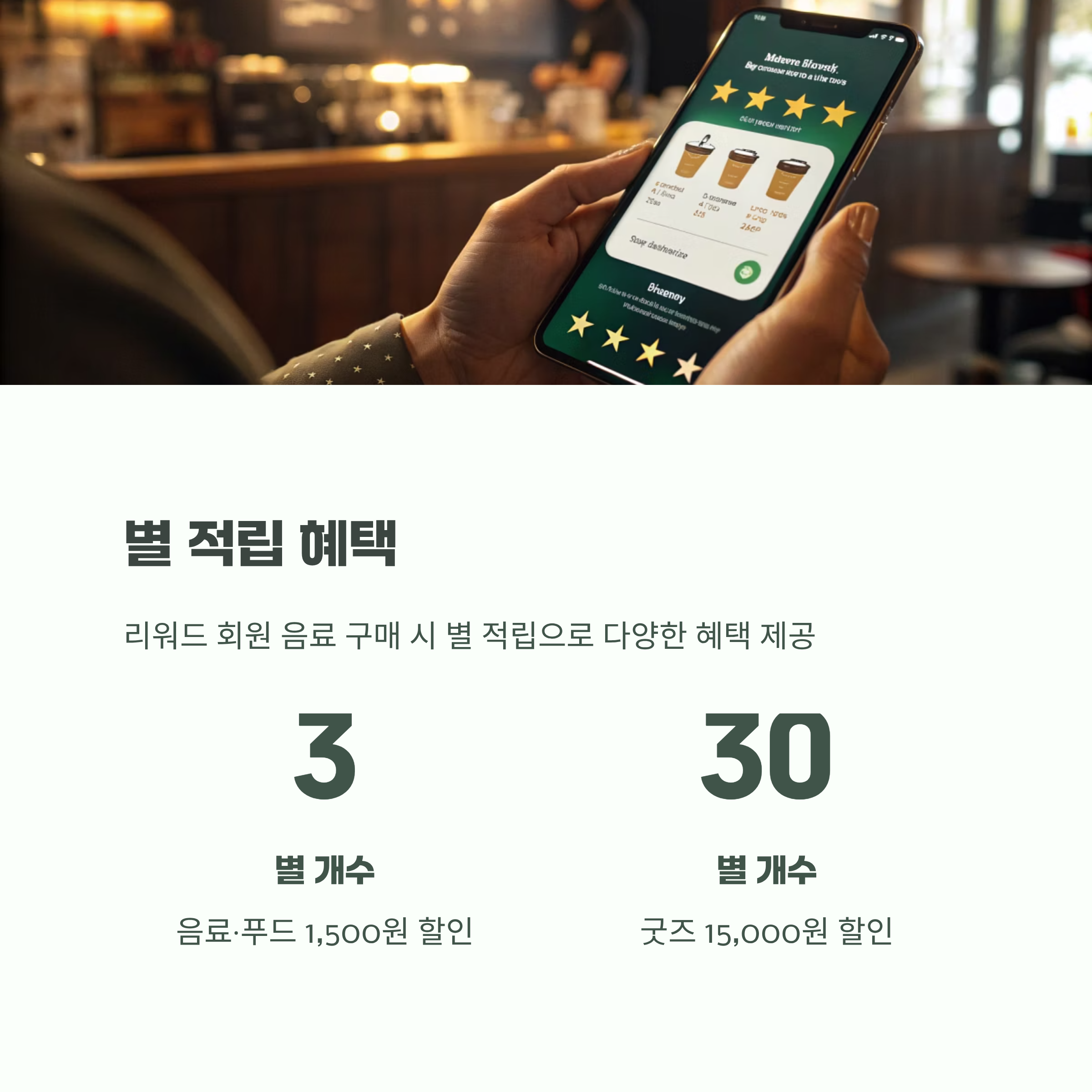 리워드 회원은 음료 구매 시 적립되는 별로 다양한 혜택을 받을 수 있습니다.
