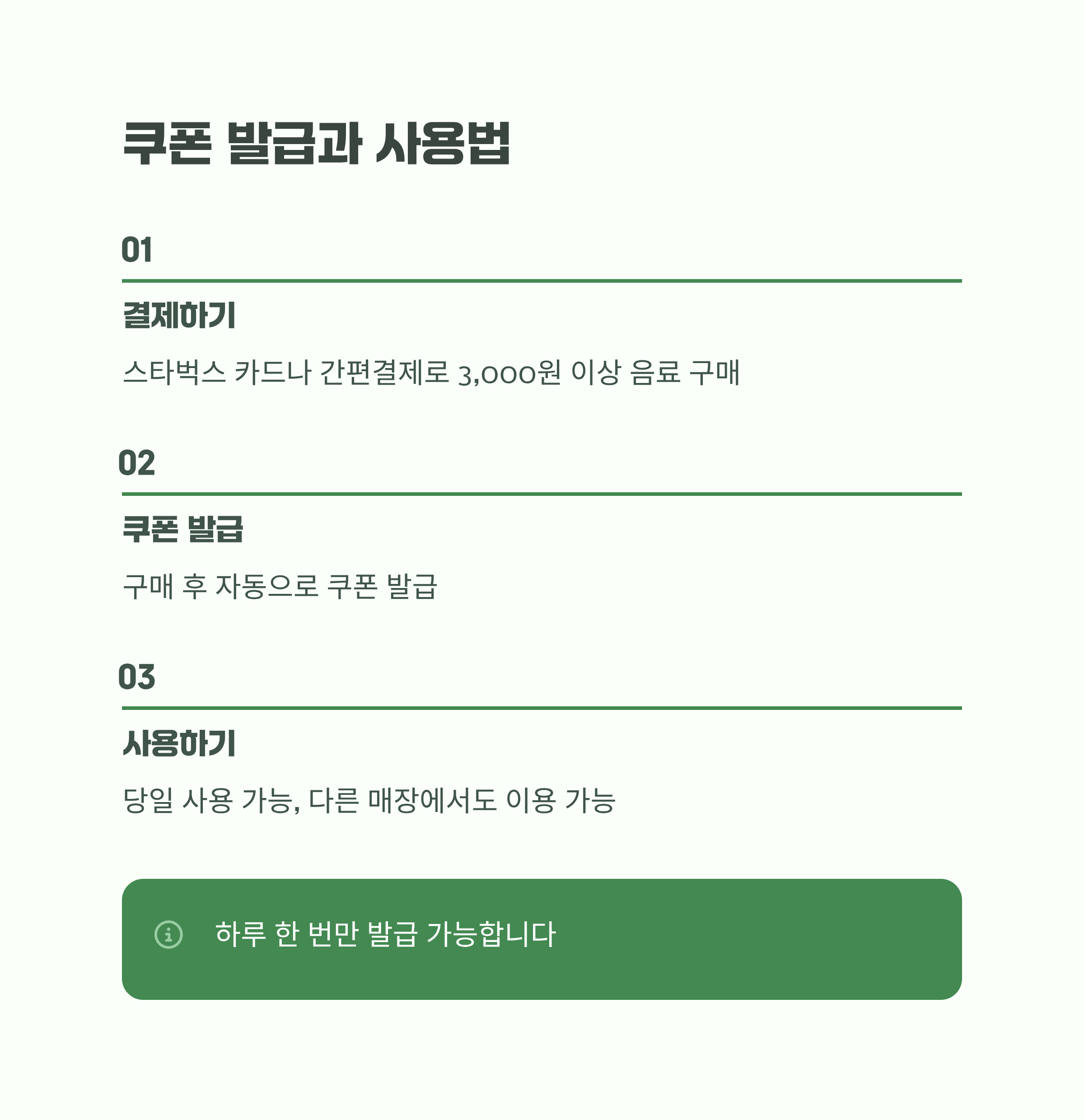 스타벅스 카드 또는 간편결제로 3,000원 이상 음료를 결제하면 쿠폰이 자동 발급됩니다. 발급 후 당일 사용 가능하며, 매장 제한 없이 다른 지점에서도 쓸 수 있어 편리합니다. 단, 하루 한 번만 발급된다는 점은 참고해야 합니다.