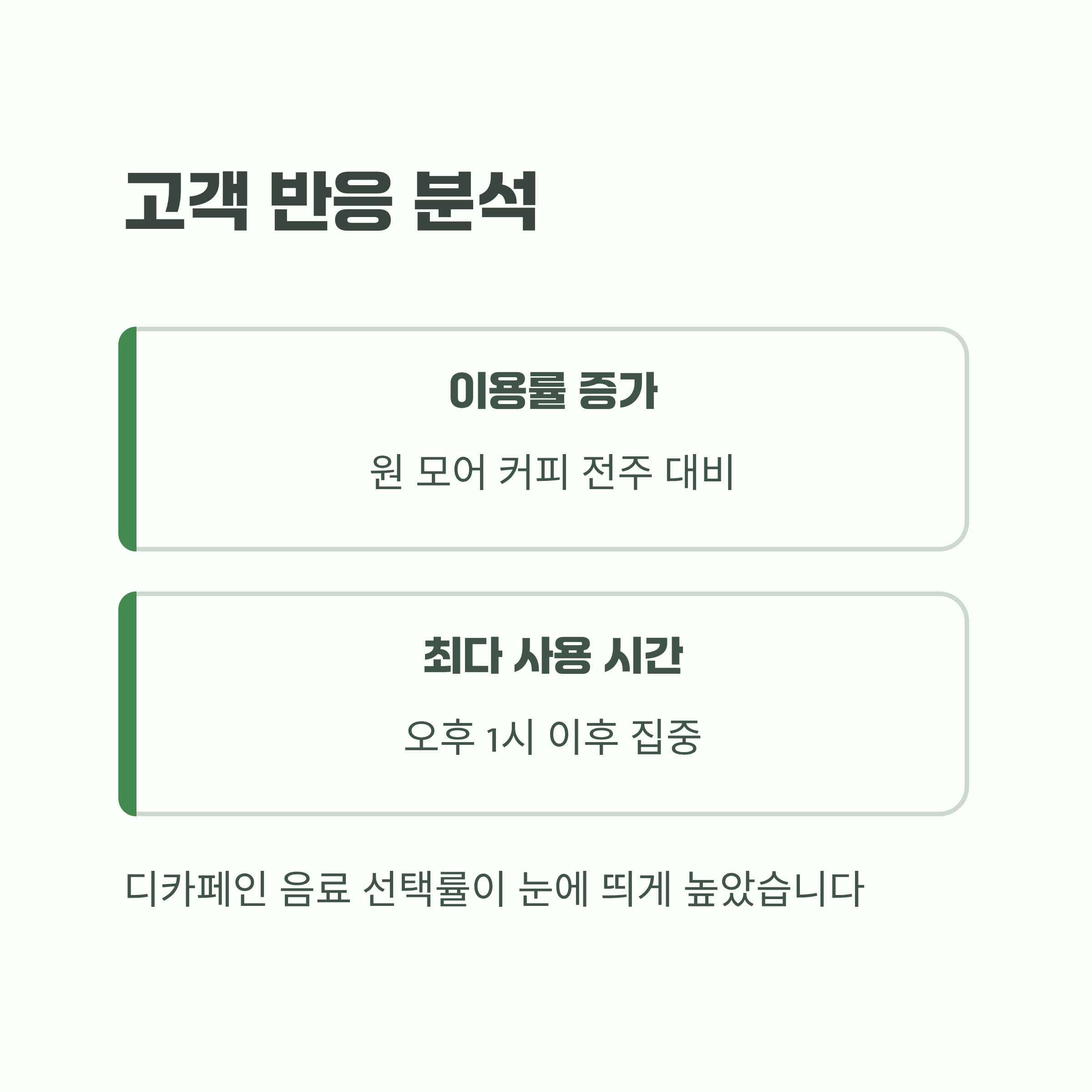 이벤트 시작과 동시에 원 모어 커피 이용률은 전주 대비 50% 증가했고, 사용 시점은 오후 1시 이후가 가장 많았습니다. 특히 디카페인 음료 선택률이 눈에 띄게 높았습니다.