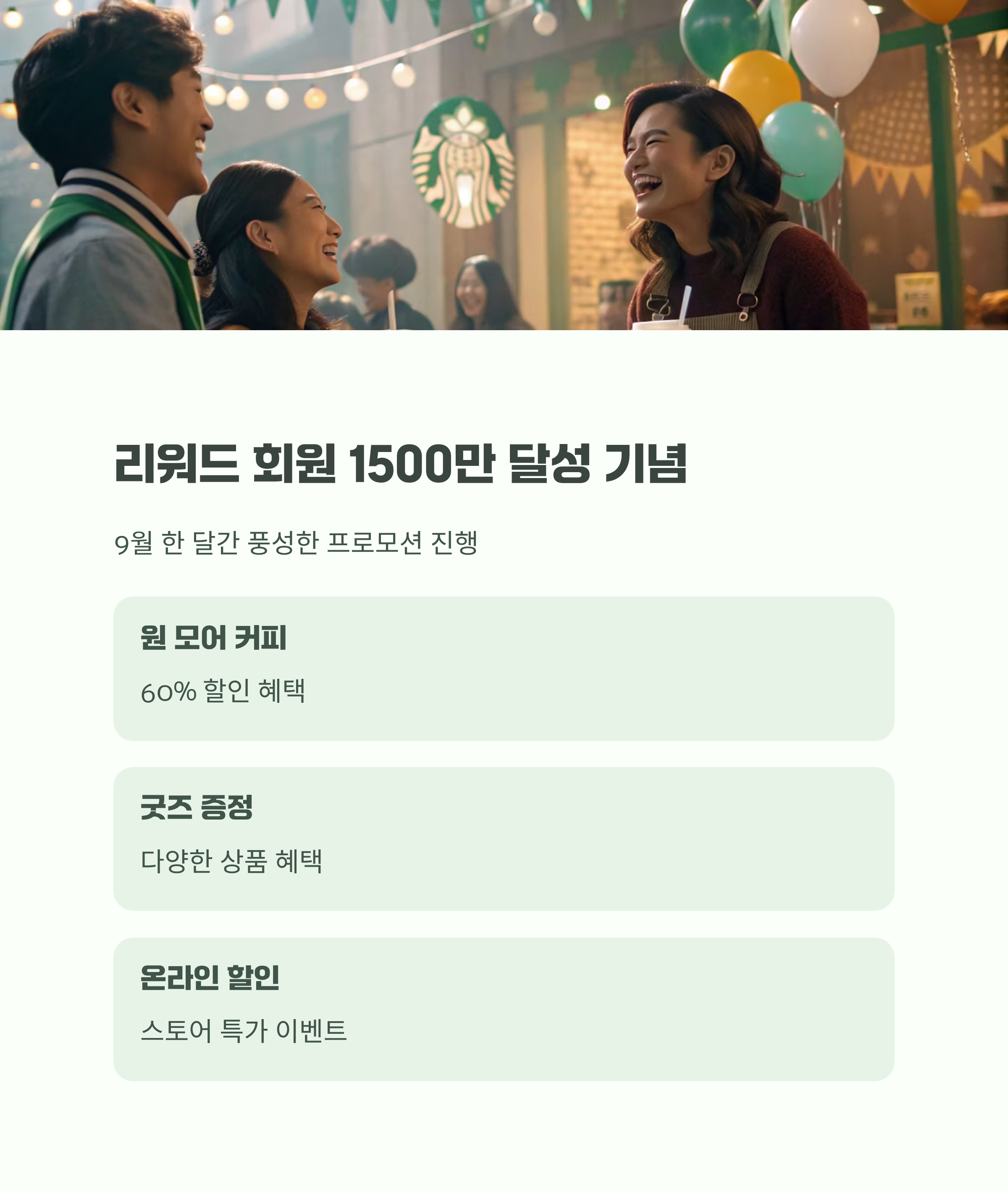 스타벅스가 9월 한 달 동안 리워드 회원 1500만 달성을 기념해 다채로운 혜택을 준비했습니다. 대표적으로 원 모어 커피 60% 할인 이벤트부터 굿즈 증정, 온라인 스토어 할인까지 알찬 혜택이 가득했는데요. 출근길, 퇴근길 언제든 합리적으로 즐길 수 있는 9월 스타벅스의 특별한 순간들을 정리해 드립니다.
