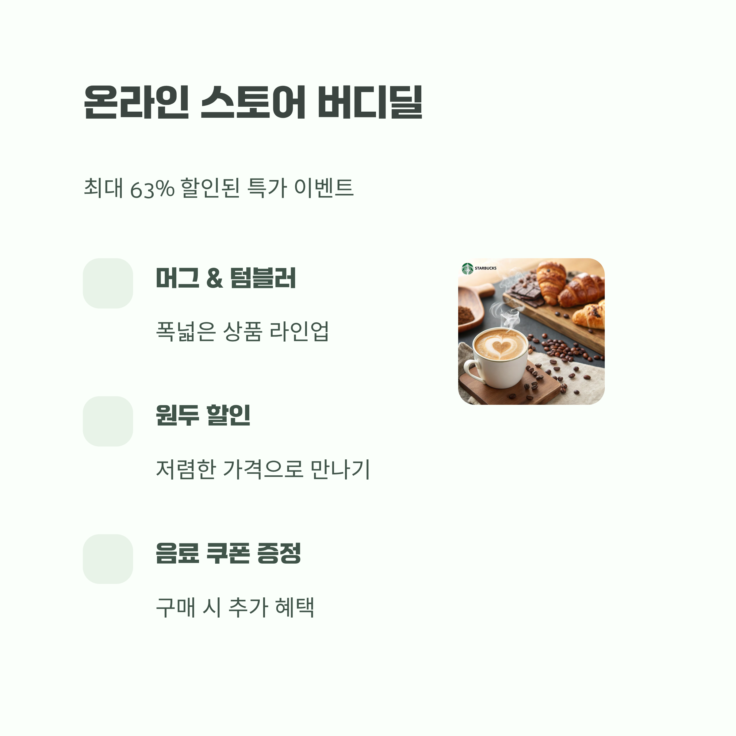 온라인 스토어에서는 최대 63% 할인된 버디딜 이벤트가 열렸습니다. 머그, 텀블러, 원두까지 폭넓은 상품을 저렴하게 만나볼 수 있었고, 일부 상품 구매 시 음료 쿠폰도 함께 증정되었습니다.