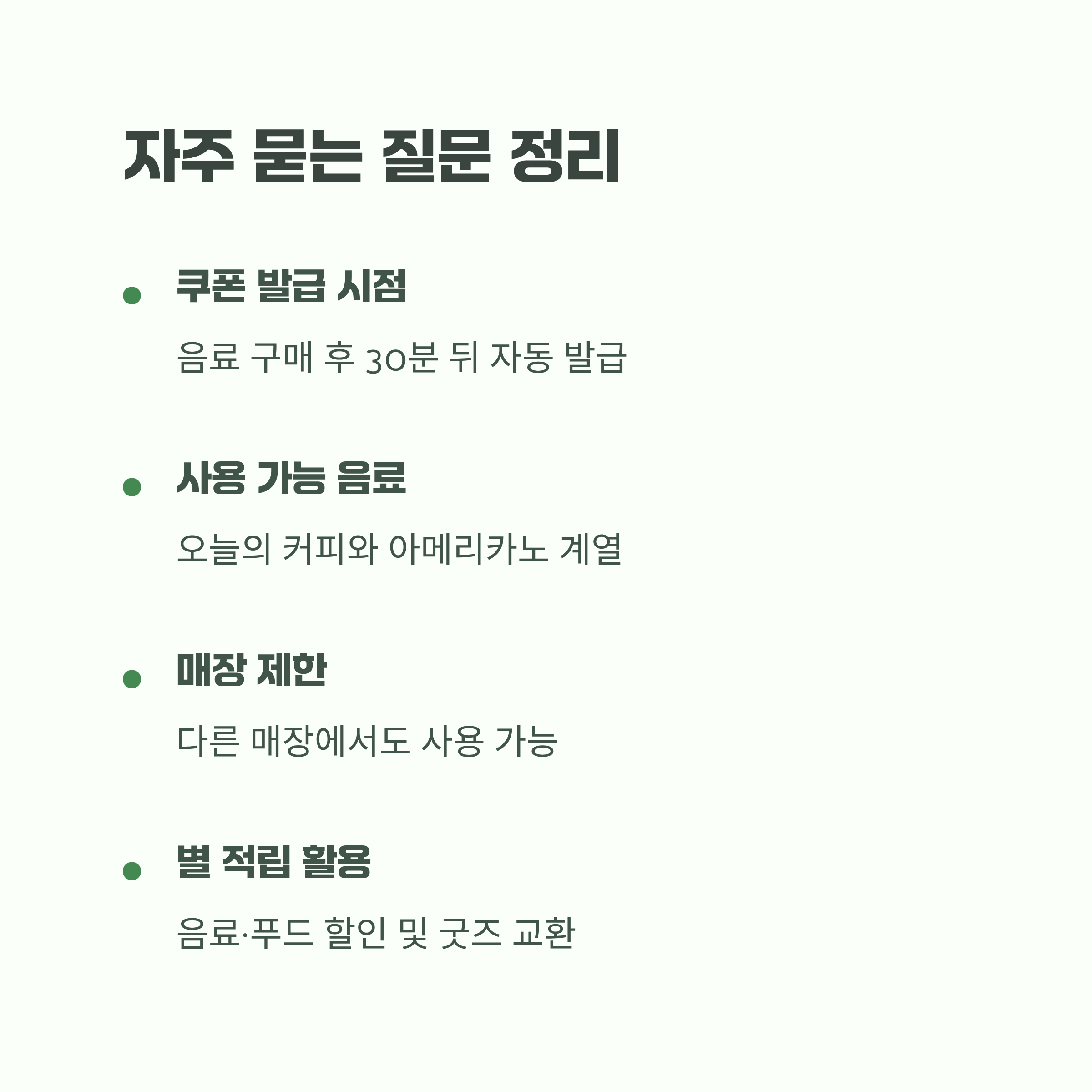 원 모어 커피 쿠폰은 리워드 회원이 음료 구매 후 30분 뒤 발급되며, 오늘의 커피와 아메리카노 계열 음료에 사용할 수 있습니다. 쿠폰은 다른 매장에서도 사용할 수 있고, 별 적립 혜택은 음료·푸드 할인 및 굿즈 교환에 활용할 수 있습니다.