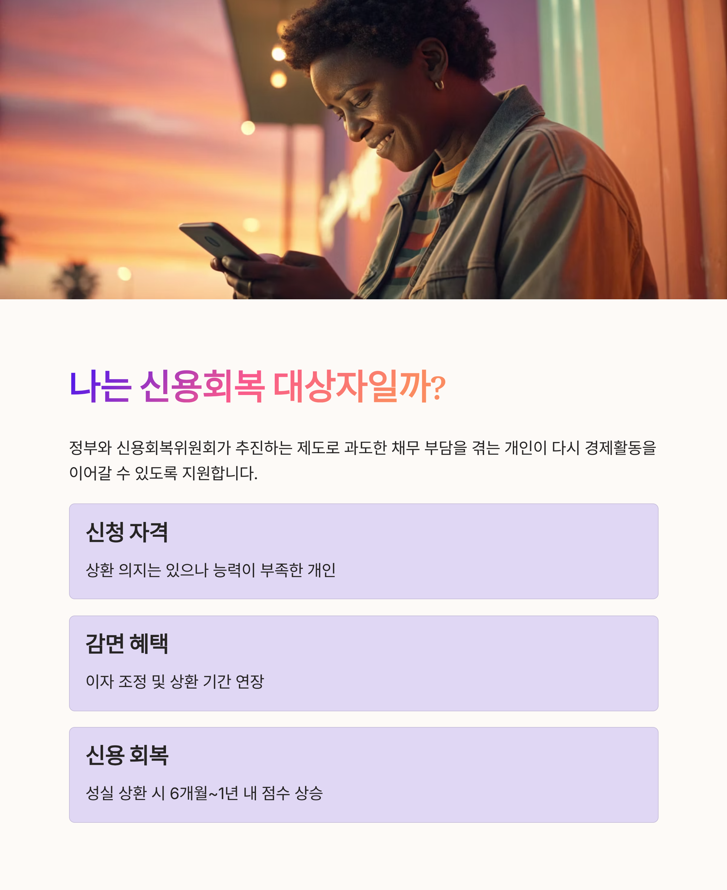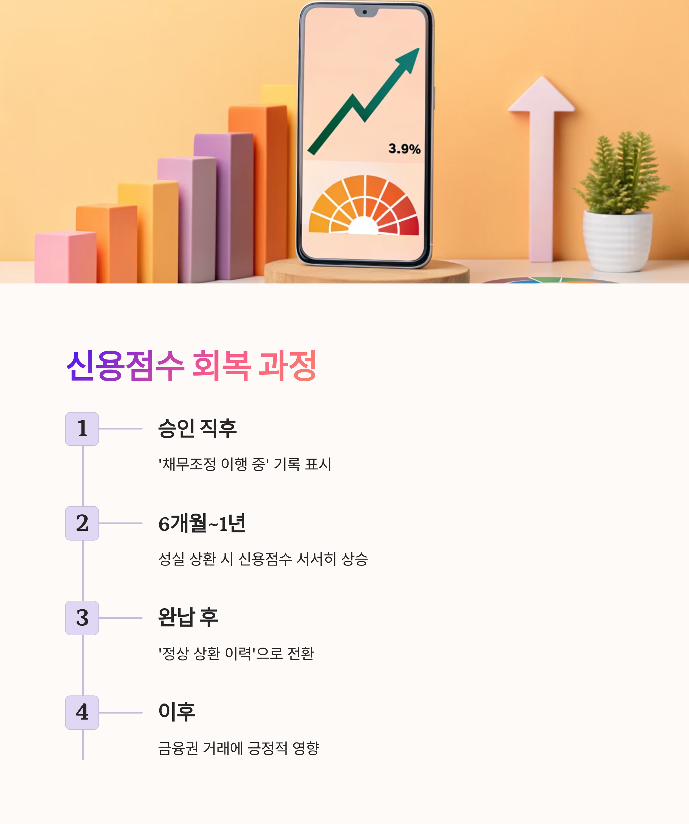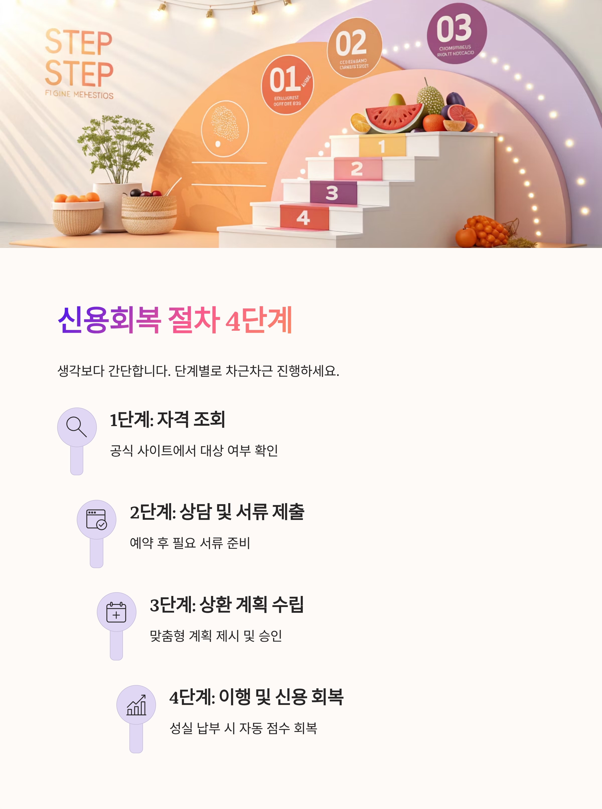 신청자의 상황에 따라 맞춤형 상환 계획이 제시되며, 승인 후 일정 기간 성실히 납부하면 신용점수 회복 절차가 자동으로 진행됩니다.