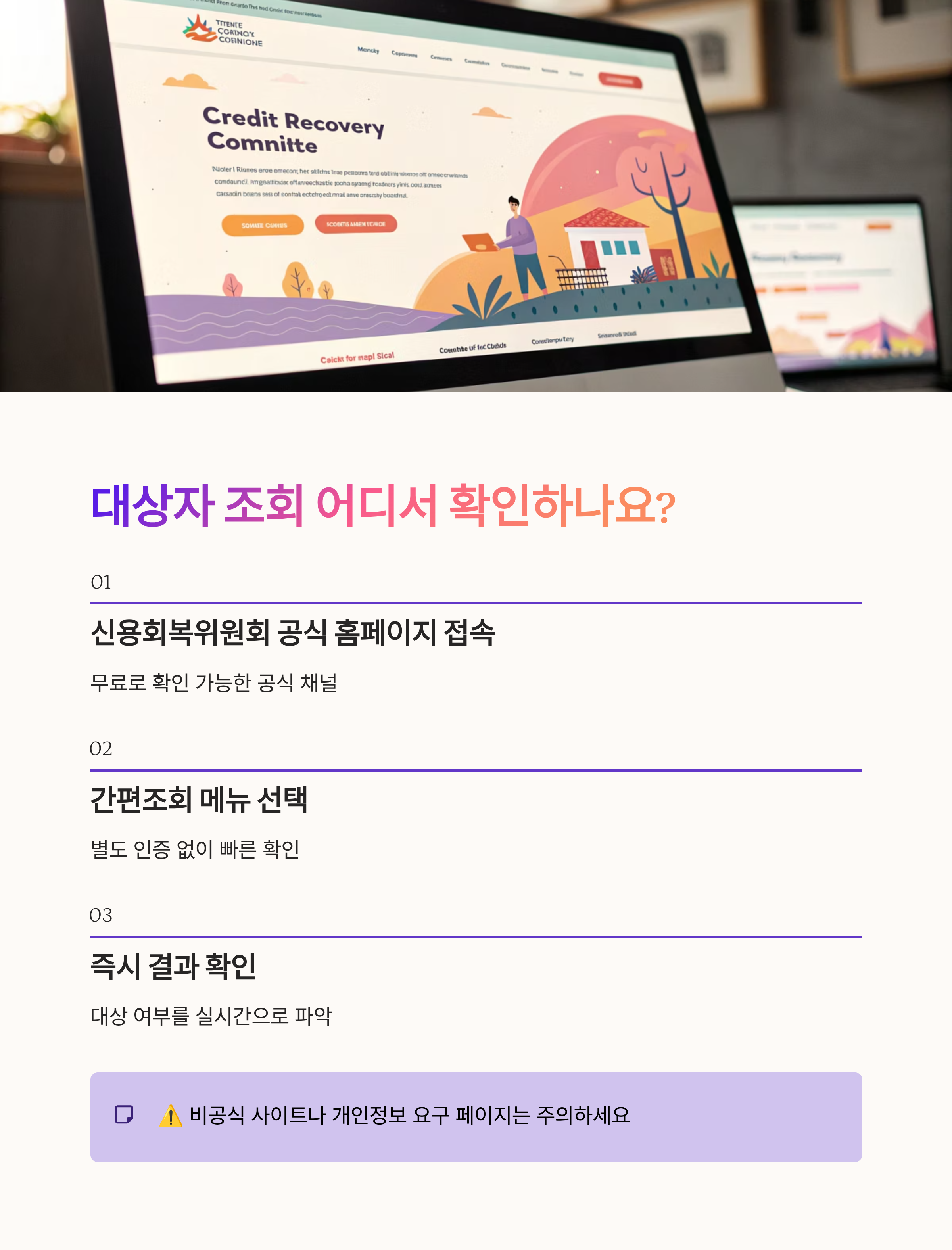 신용회복 대상자 여부는 신용회복위원회 공식 홈페이지에서 무료로 확인할 수 있습니다.