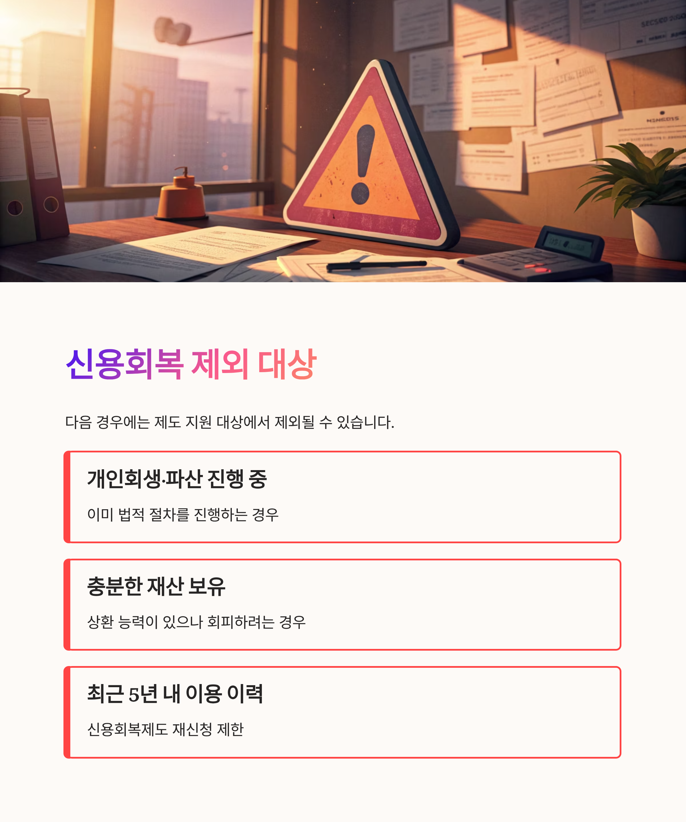 예를 들어, 이미 개인회생 절차를 진행 중이거나 파산 선고를 받은 경우, 또는 재산이 충분한데 상환을 회피하려는 경우는 제외됩니다.