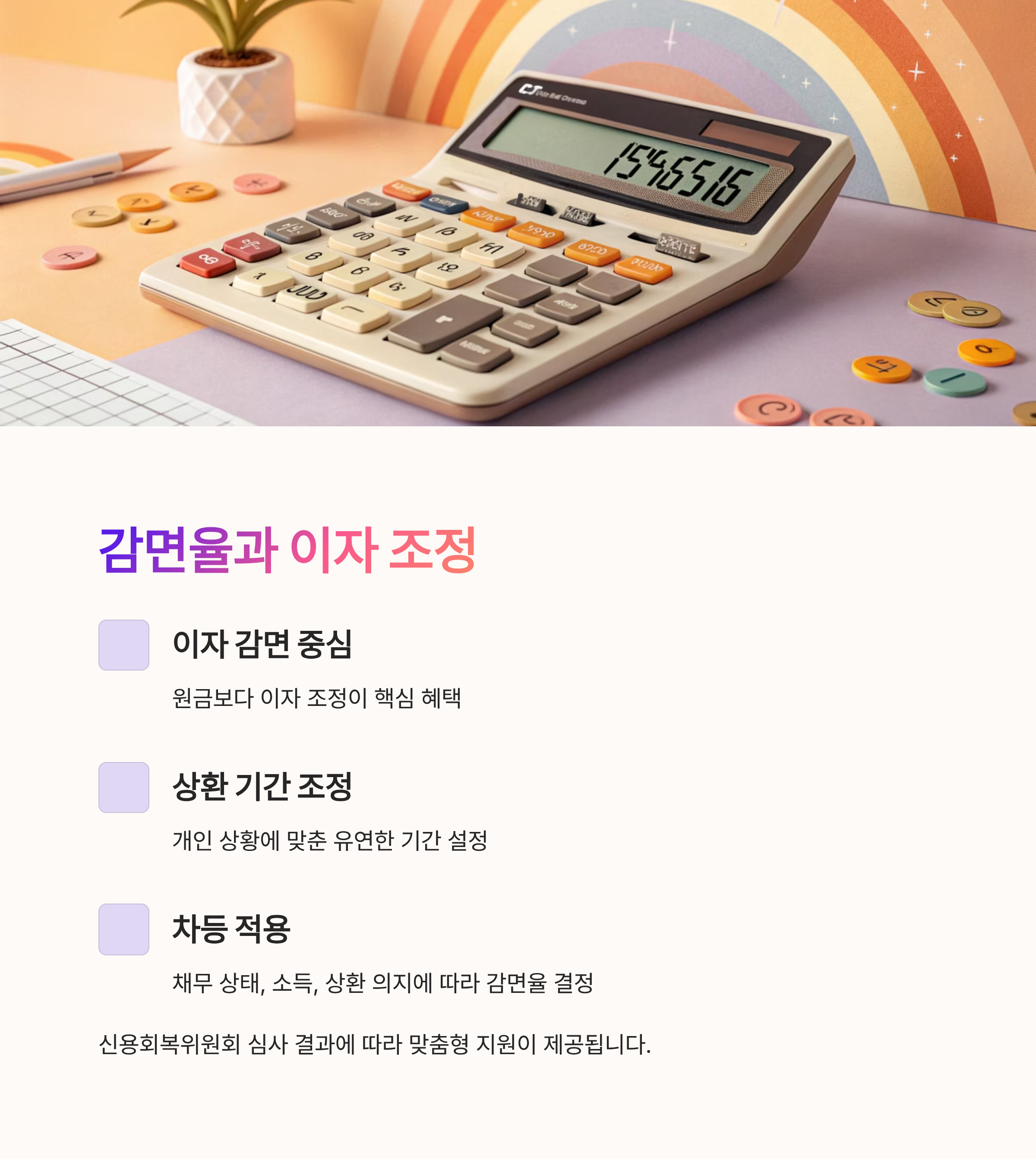 대부분의 경우 원금보다 이자 조정이 중심이며, 신용회복위원회 심사 결과에 따라 차등 적용됩니다.