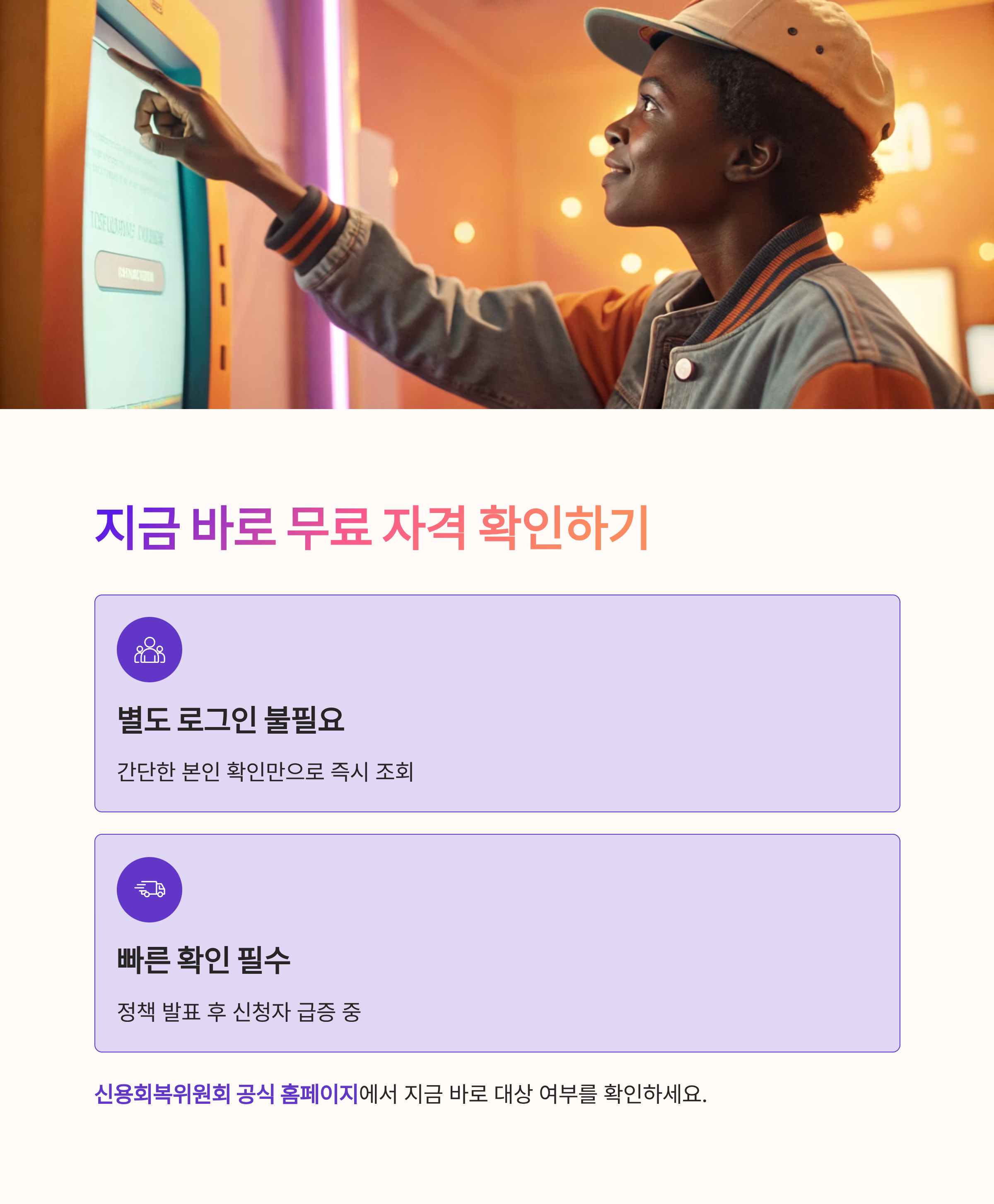 지금 바로 신용회복위원회 공식 홈페이지에서 무료 자격 확인하기 서비스를 이용해보세요.