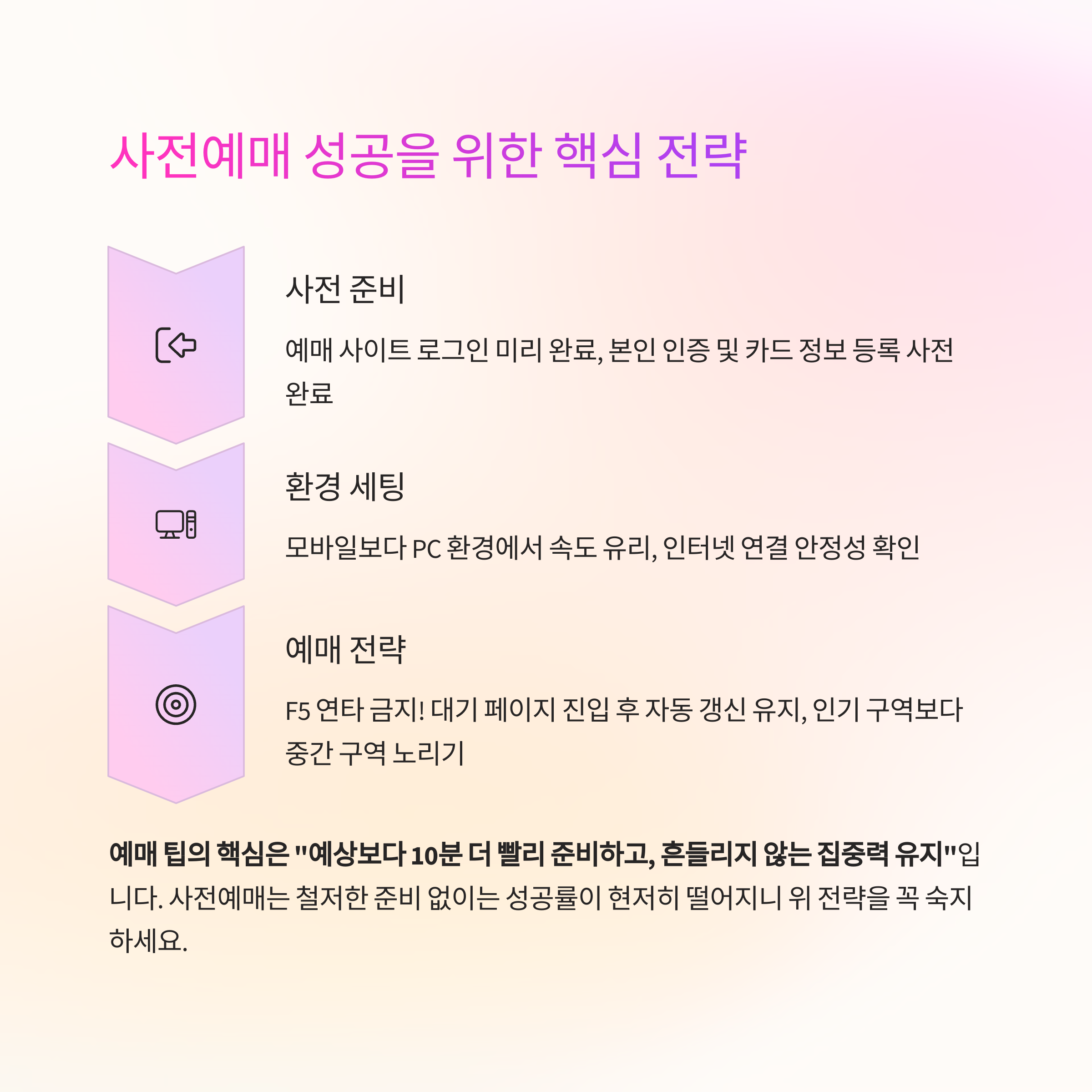 예매 팁의 핵심은 "예상보다 10분 더 빨리 준비하고, 흔들리지 않는 집중력 유지"입니다.