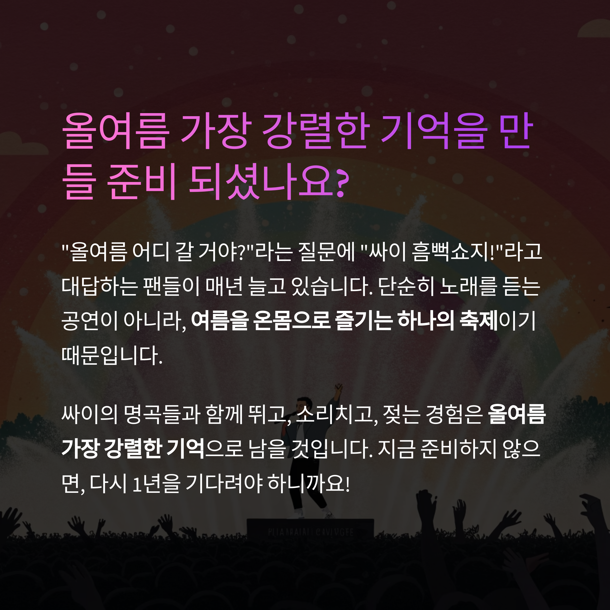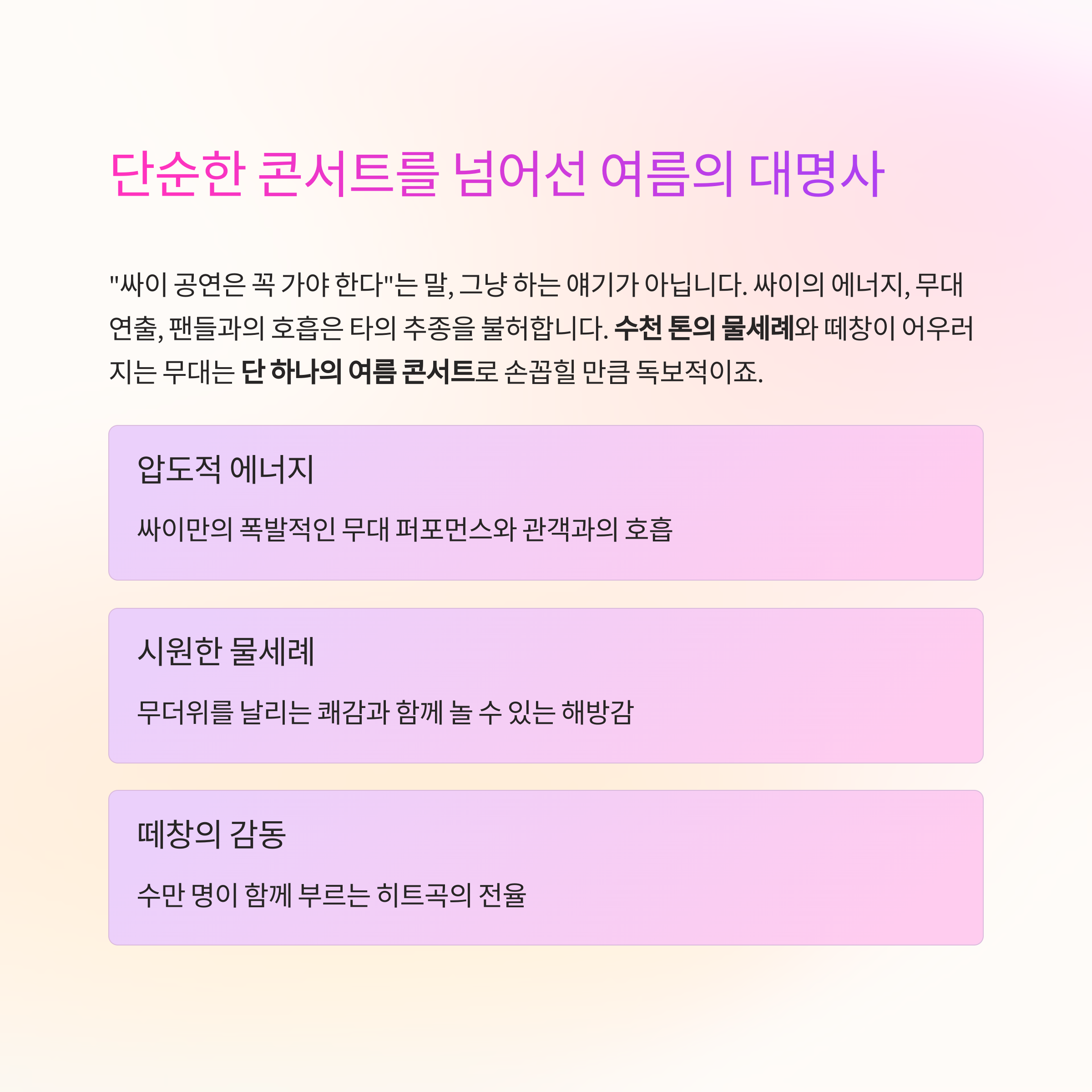 단순히 노래를 듣는 공연이 아니라, 여름을 온몸으로 즐기는 하나의 축제이기 때문입니다.