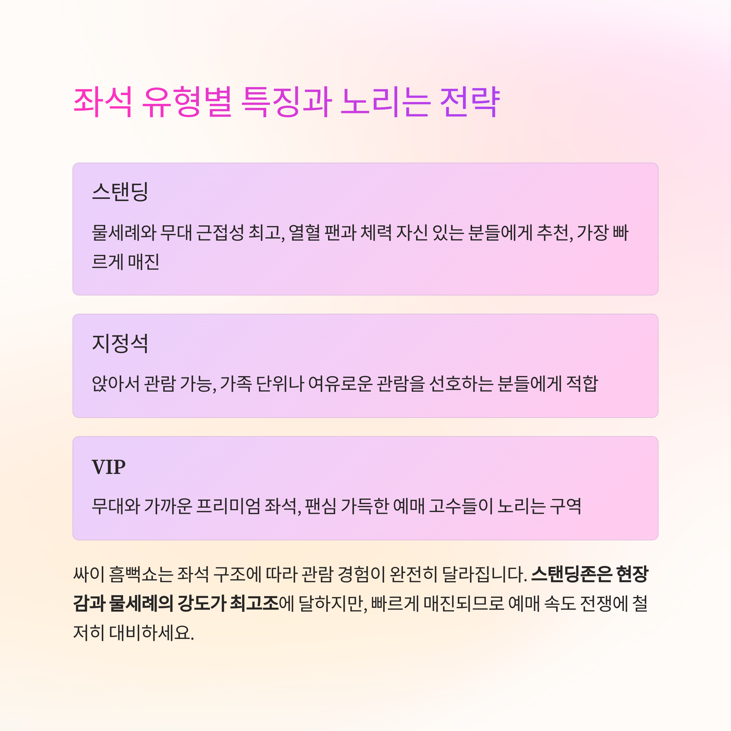 | VIP | 무대 가까움, 빠른 매진 | 팬심 가득한 예매 고수 |