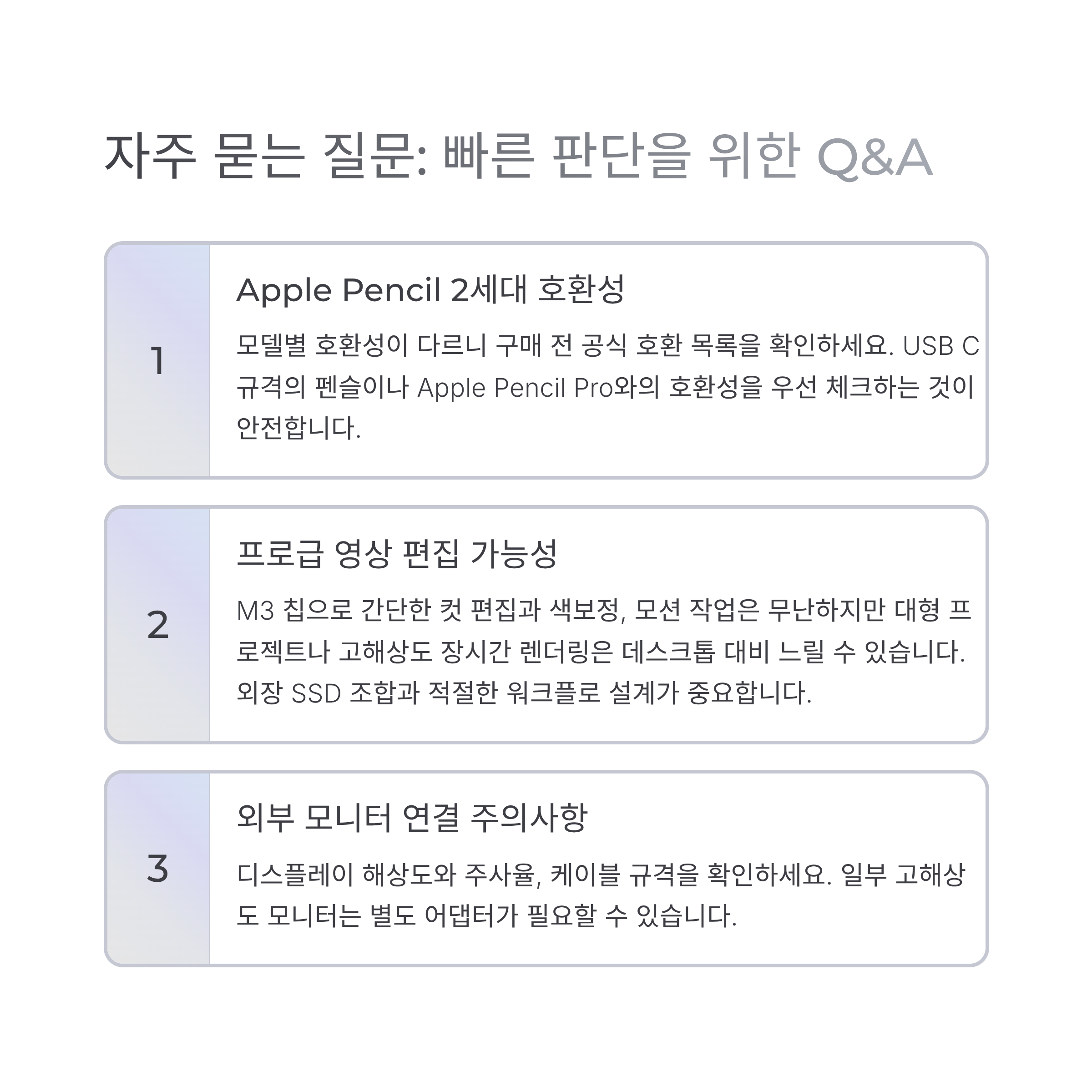 A. 모델별 호환성이 다르니 구매 전 공식 호환 목록을 확인하세요. USB C 규격의 펜슬이나 Apple Pencil Pro와의 호환성을 우선 체크하시는 것이 안전합니다.