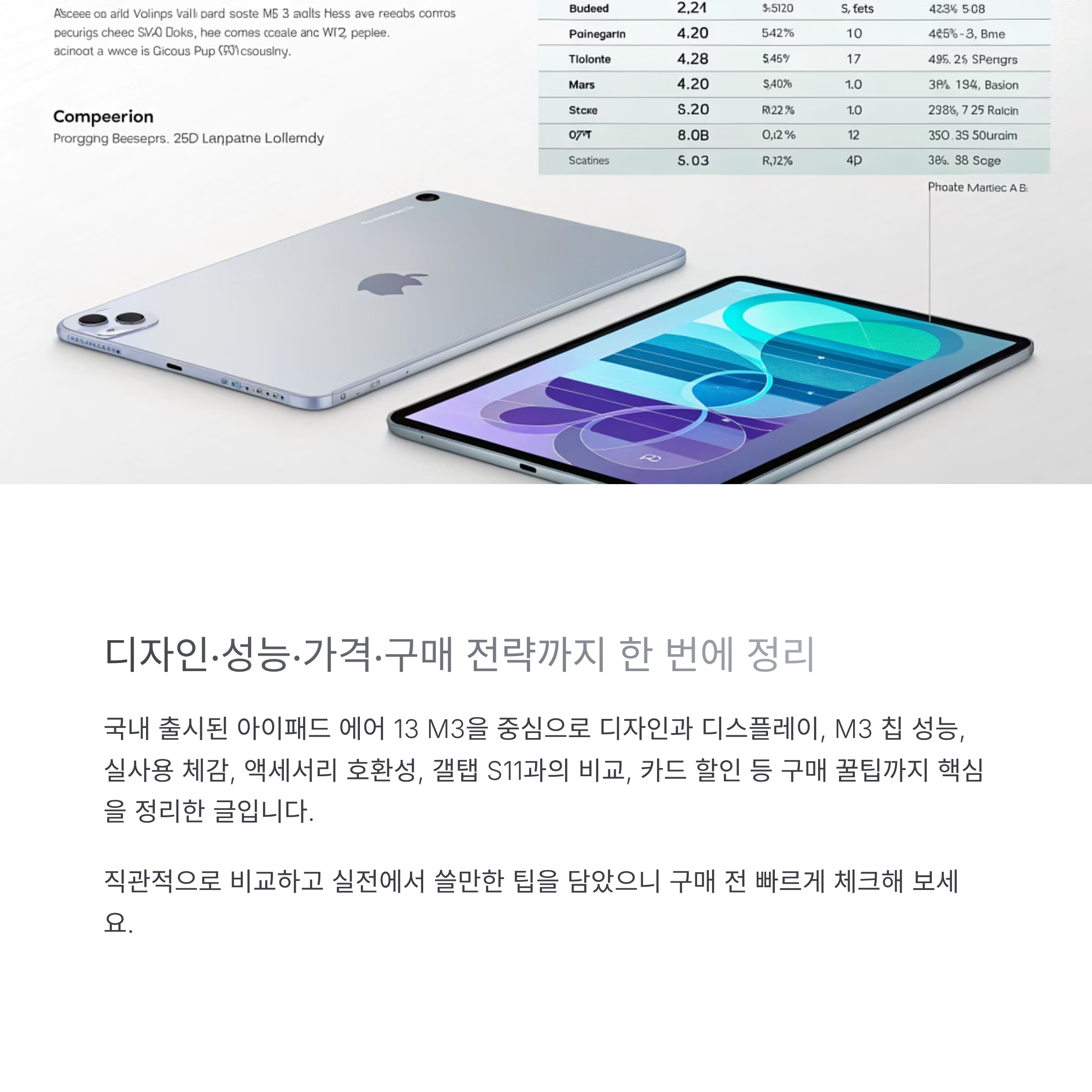 국내 출시된 아이패드 에어 13 M3을 중심으로 디자인과 디스플레이, M3 칩 성능, 실사용 체감, 액세서리 호환성, 갤탭 S11과의 비교, 카드 할인 등 구매 꿀팁까지 핵심을 정리한 글입니다. 직관적으로 비교하고 실전에서 쓸만한 팁을 담았으니 구매 전 빠르게 체크해 보세요.
