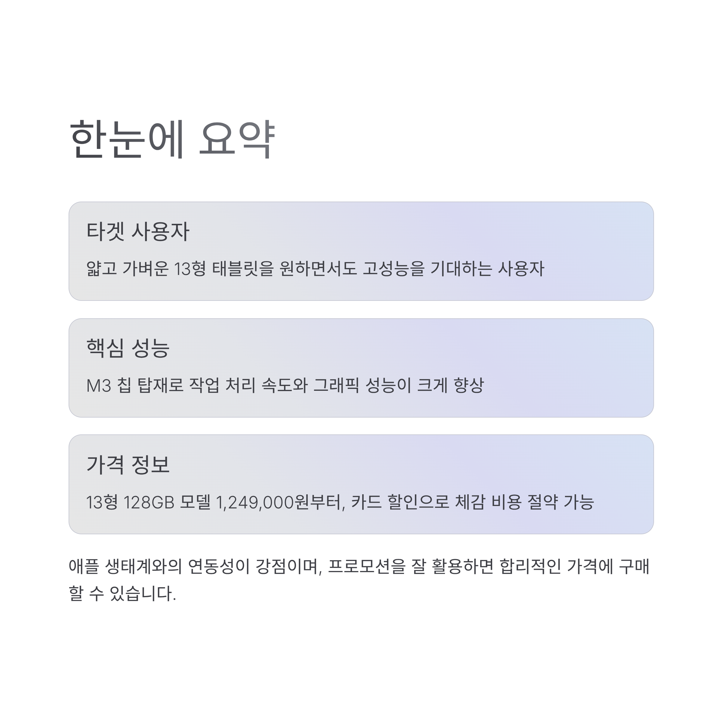 아이패드 에어 13 M3는 얇고 가벼운 13형 태블릿을 원하면서도 고성능을 기대하는 사용자를 겨냥한 모델입니다. M3 칩 탑재로 작업 처리 속도와 그래픽 성능이 크게 향상되었고, 애플 생태계와의 연동성이 강점입니다. 가격은 13형 128GB 모델이 1,249,000원부터 시작하며 카드 할인과 프로모션을 잘 활용하면 체감 비용을 낮출 수 있습니다.