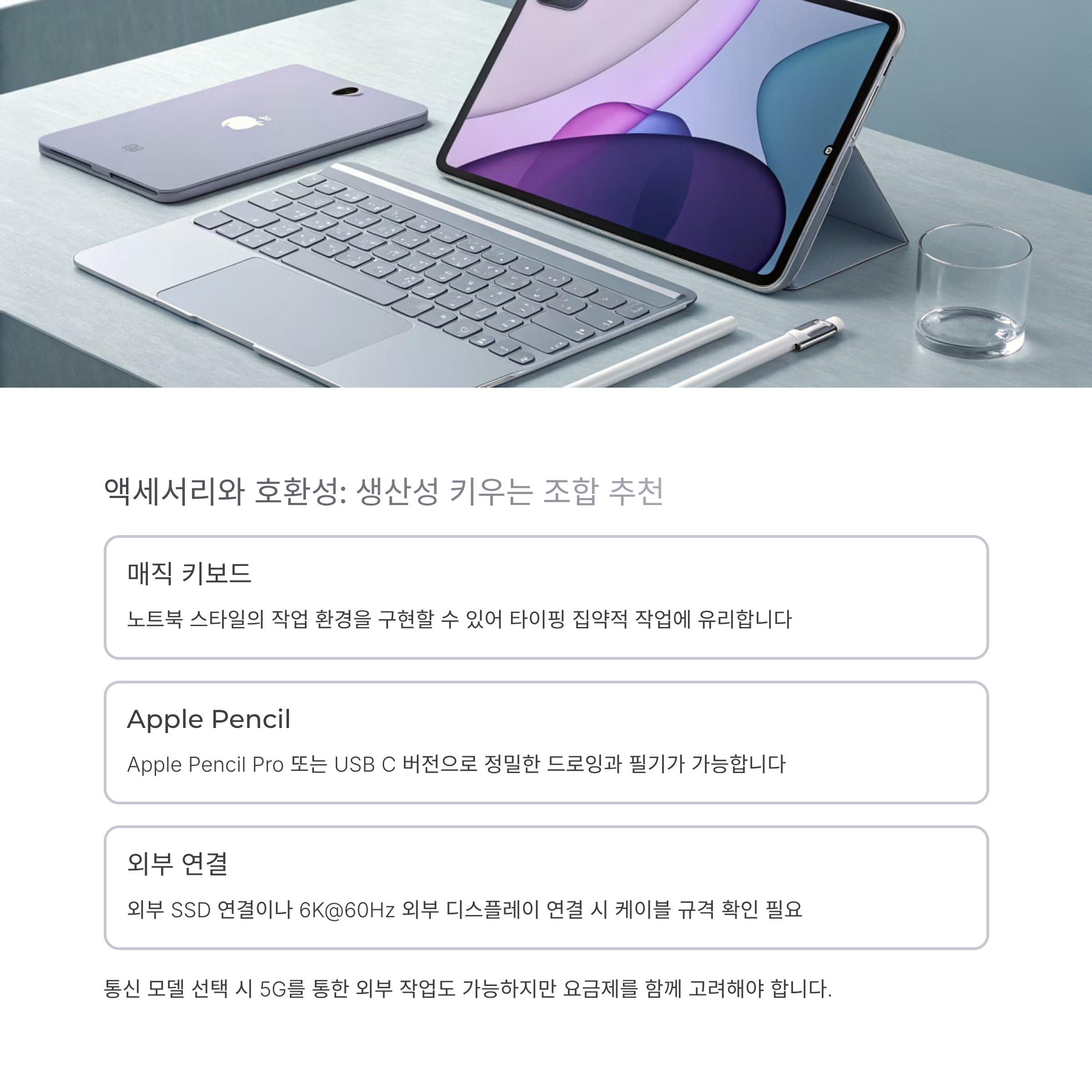 매직 키보드와 결합하면 노트북 스타일의 작업 환경을 구현할 수 있고, Apple Pencil Pro 또는 USB C 버전 펜슬로 정밀한 드로잉과 필기가 가능합니다. 사진·영상 편집자로서 외부 SSD 연결이나 6K@60Hz 외부 디스플레이 연결을 고려한다면 케이블 규격과 전력 공급 조건을 미리 확인하세요. 통신 모델을 선택하면 외부에서 5G를 통한 작업도 가능하지만 요금제를 함께 따져야 합니다.