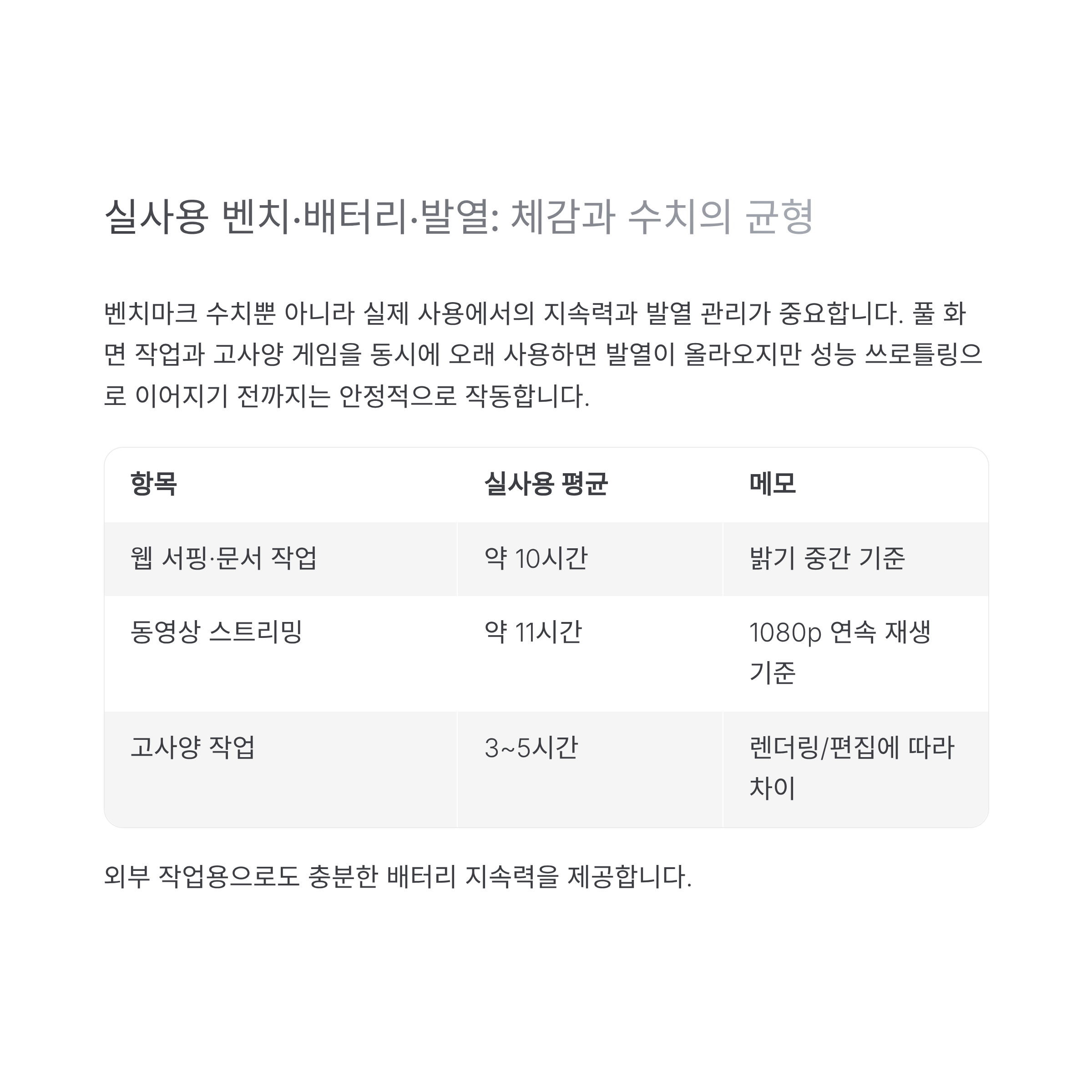 벤치마크 수치뿐 아니라 실제 사용에서의 지속력과 발열 관리가 중요합니다. 풀 화면 작업과 고사양 게임을 동시에 오래 사용하면 발열이 올라오지만 성능 쓰로틀링으로 이어지기 전까지는 안정적으로 작동합니다. 배터리는 통상적인 작업 기준으로 10시간 안팎을 기대할 수 있어 외부 작업용으로도 충분합니다.
